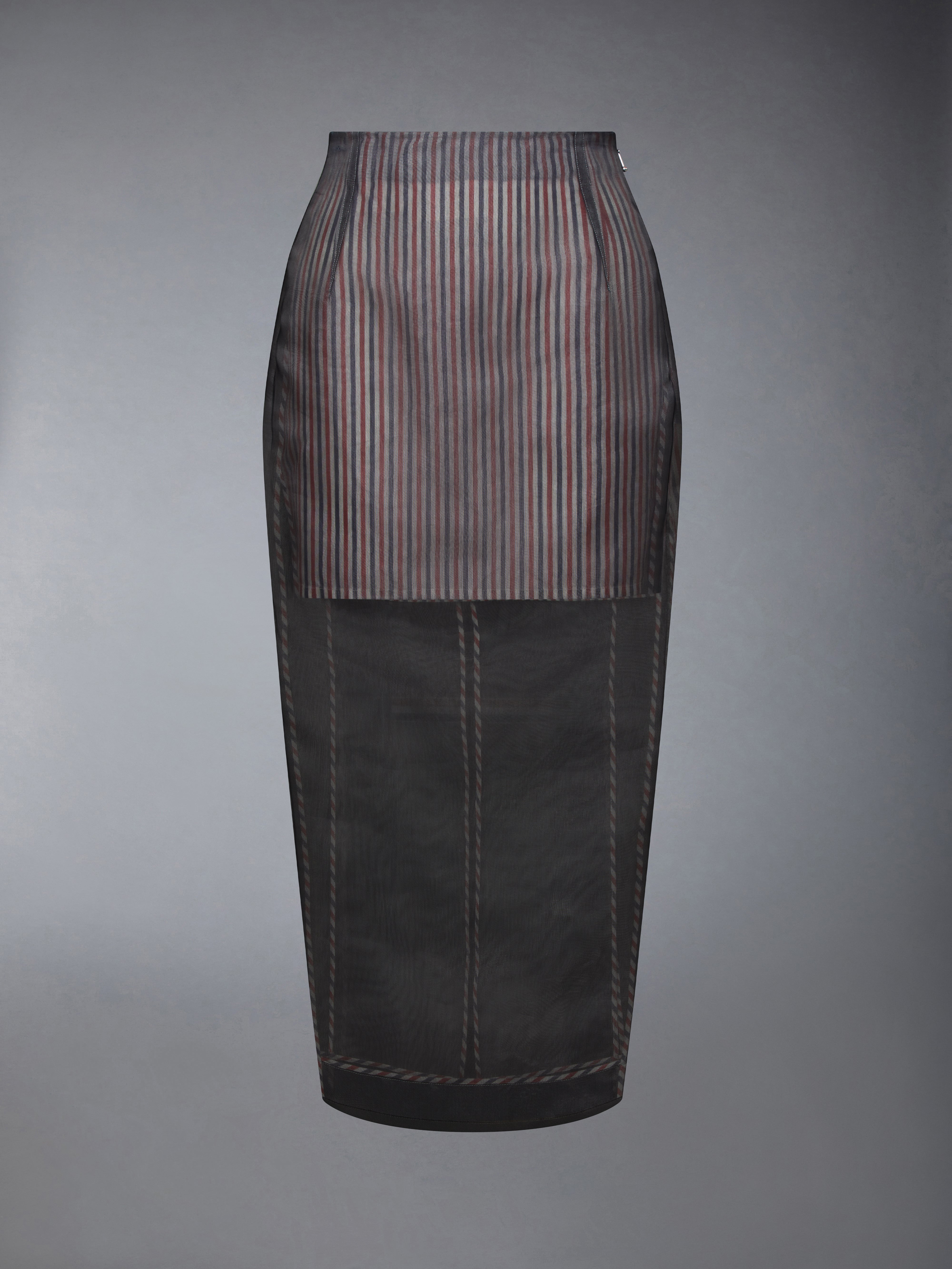 A black-tie piece that leaves a lasting impression. Sheer fabric drapes gracefully over our signature tricolor striped lining, revealing an exposed inseam that is unmistakably Thom Browne. Inspired by couture looks from the Thom Browne runway, this distinctive piece is a memorable choice for special events. Pair it seamlessly with our Silk Organza Corset and Silk Organza Sport Coat. Side zip closure Buttoned backstrap with signature striped grosgrain trim Visible tricolor stripe lining Signature striped grosgrain loop tab Model is 5'10" (178 cm), wearing size 40 100% Silk Combo 1: 100% Polyamide Lining: 100% Cupro Made in Italy FGCA29B-05762-001