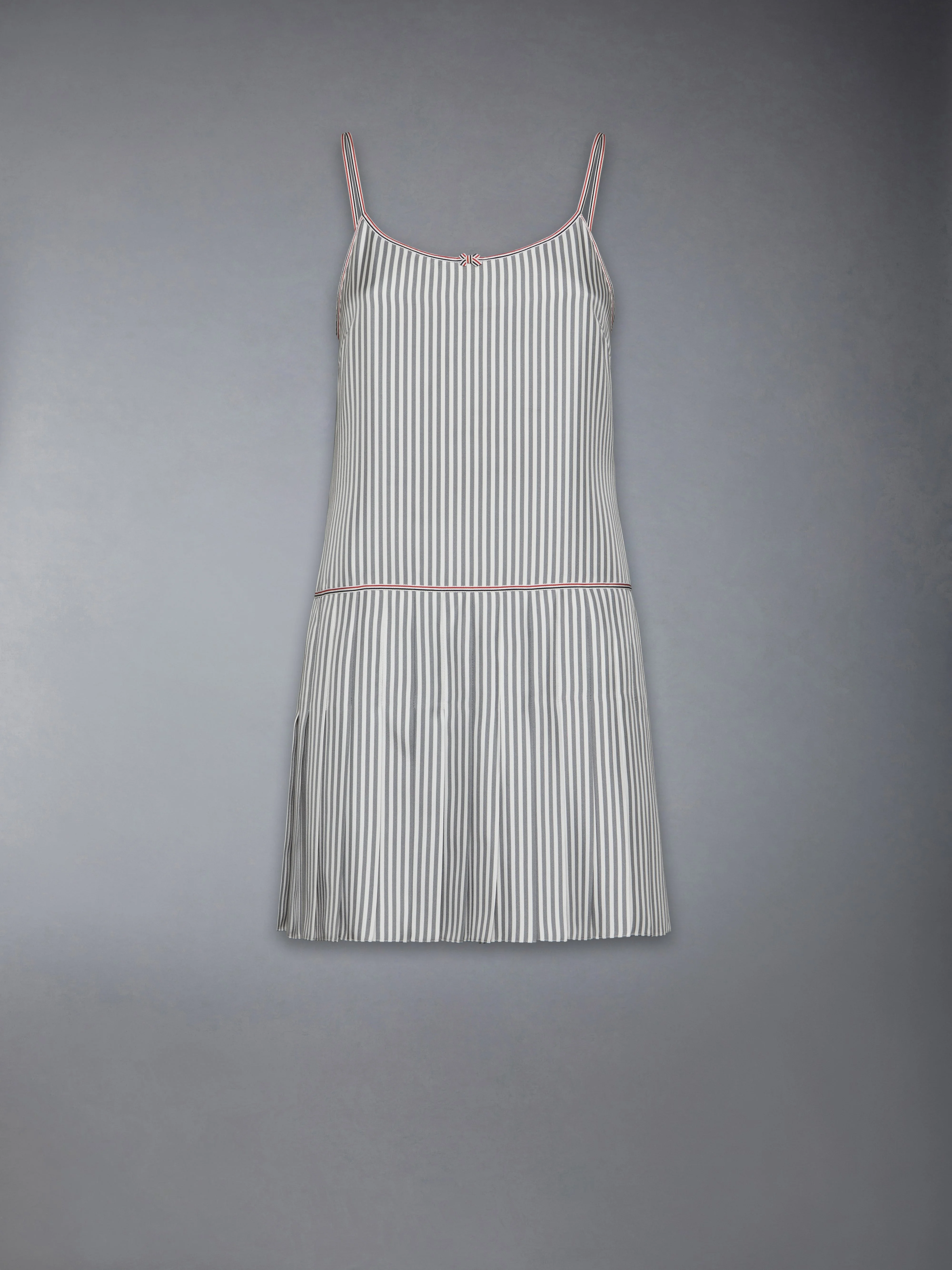 DETAILS & FIT Inspired by the timeless spirit of Americana, this piece marries the enduring elegance of the slip dress with distinctive Thom Browne emblems. Crafted from delicate silk twill, it’s the perfect choice for the spring season. Signature striped grosgrain loop tab Model is 5'10" (178 cm), wearing size 40 100% Silk Made in Italy FDSF09A-F0819-035