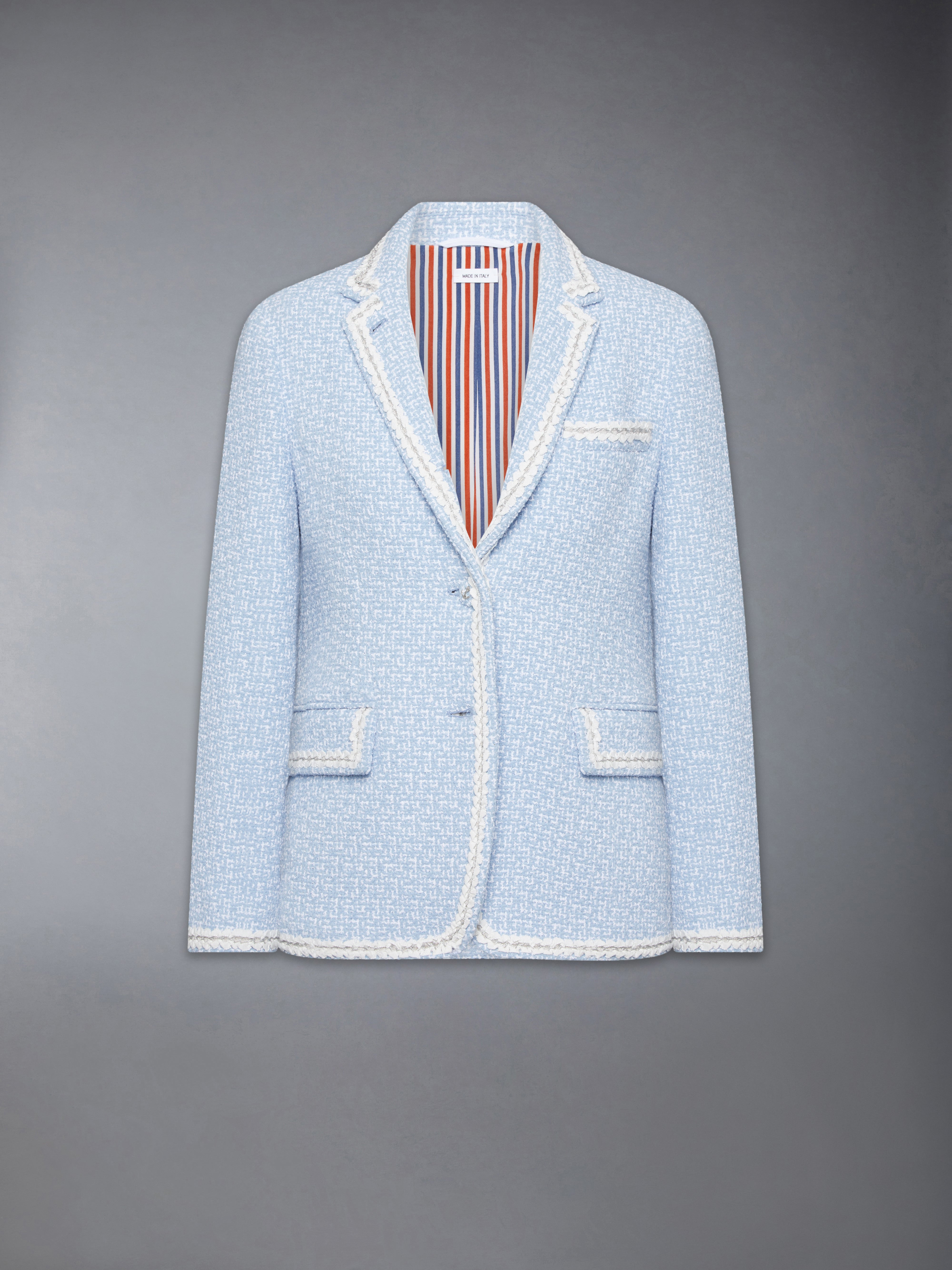 Made to pair with our Solid Tweed Knee Length Pleated Skirt, this gorgeous sport coat features self-covered buttons with a silver Thom Browne insignia. It showcases Thom's commitment to meticulous craftsmanship and attention to detail. Our solid tweed fabric is comprised of four different yarns. Front button closure Single chest pocket 2 Front flap pockets Buttoned cuffs with signature striped grosgrain trim Double vented back Interior pockets with name tag Signature striped grosgrain loop tab Fit 1 Model is 5'10" (178 cm), wearing size 40 78% Cotton, 18% Polyester, 4% Other Fibres Lining: 100% Silk Made in Italy FBC700B-F0959-480
