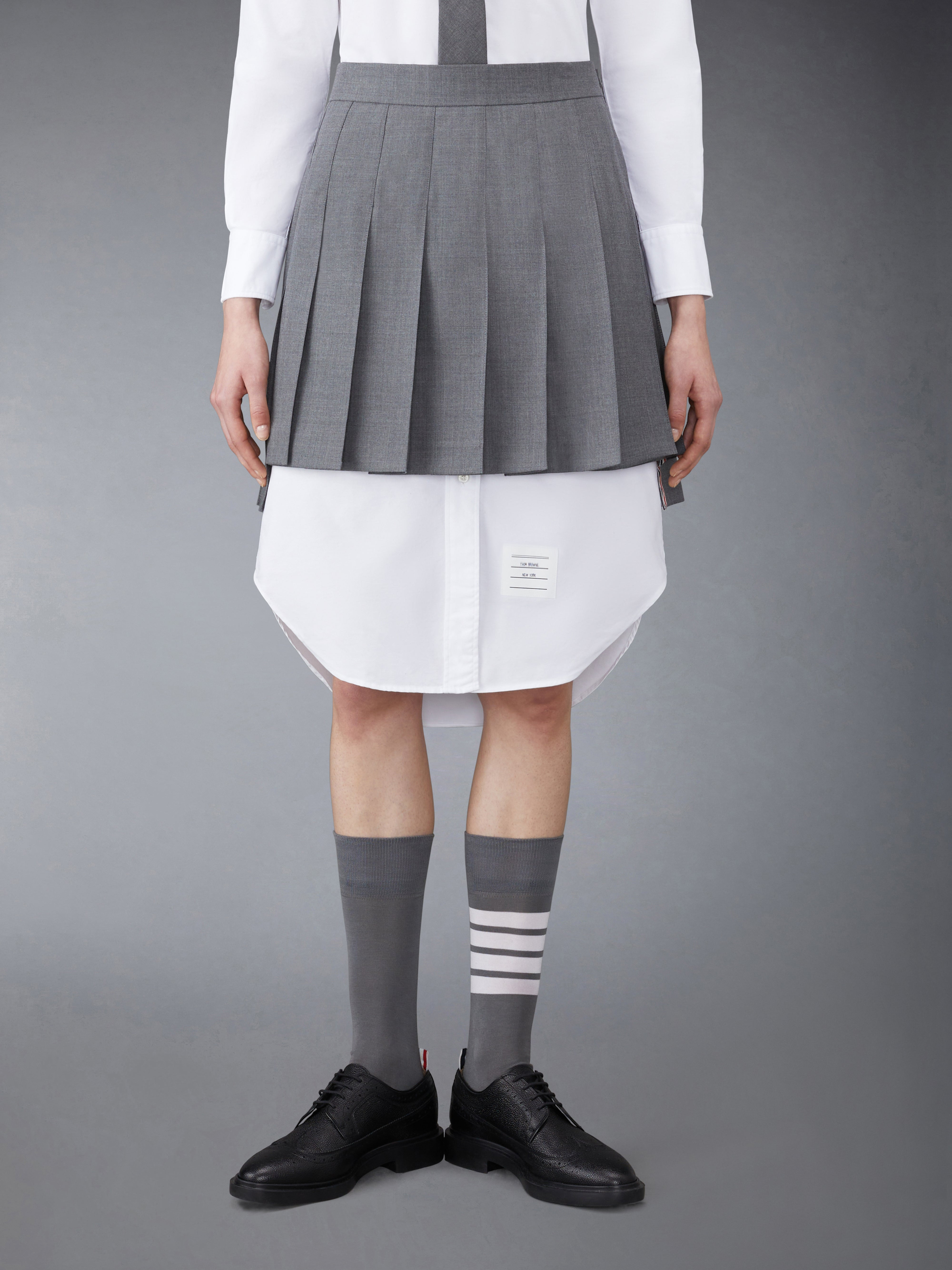 DETAILS & FIT Inspired by East Coast preppy icons but reimagined with inventive proportions and quality craftsmanship, our Super 120's Twill Wool Thigh Length Dropped Back Pleated Skirt is a fresh take on a traditional silhouette. Pair with our leather brogue heels. Side zip closure Adjustable button backstrap Dropped back hem with signature grosgrain trim Signature striped grosgrain loop tab at back waist Model is 5' 10" (178cm), wearing size 40 100% Wool Lining: 100% Cupro Made in Italy FGC402V-00626-035
