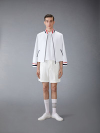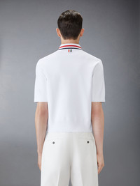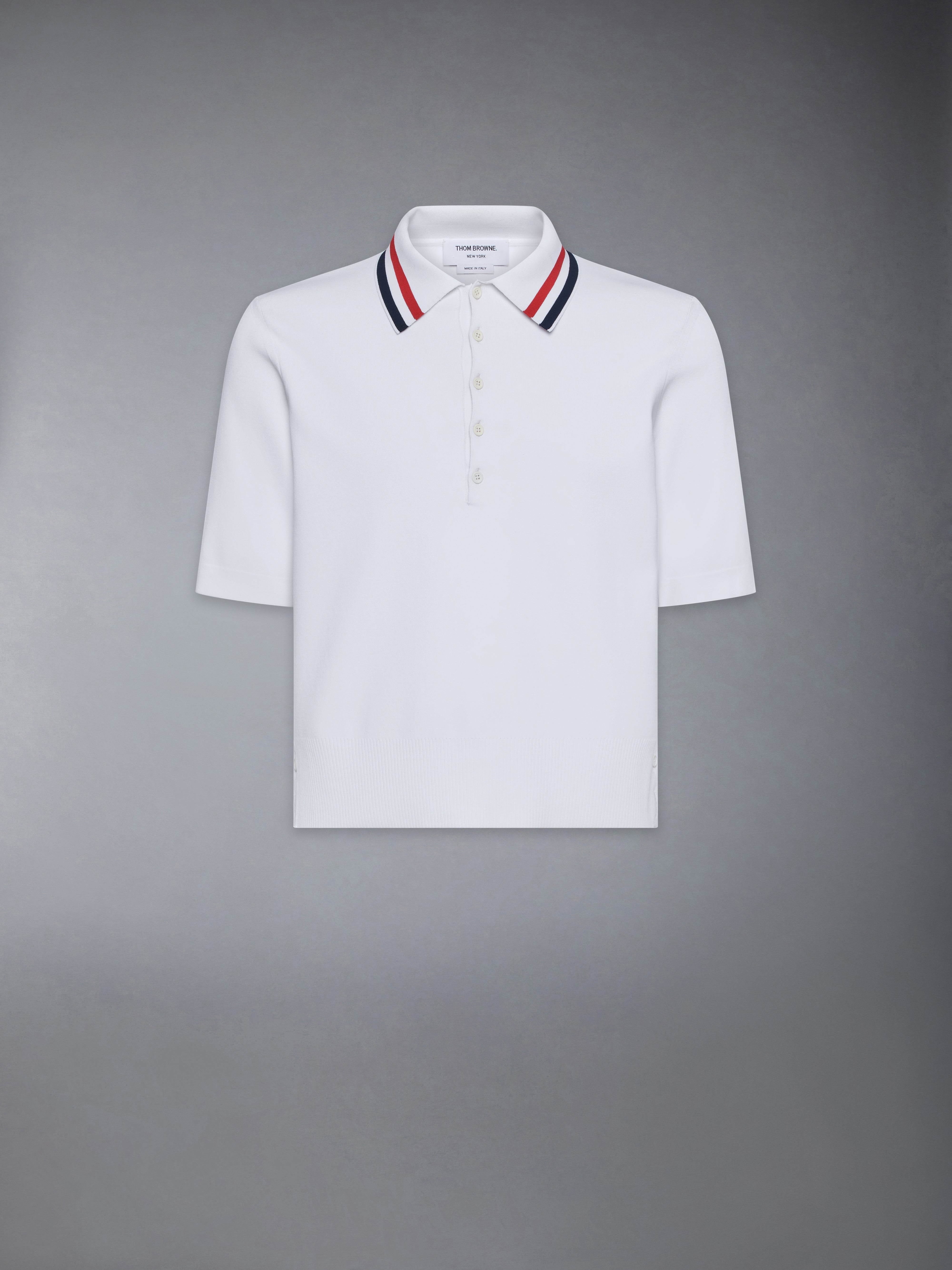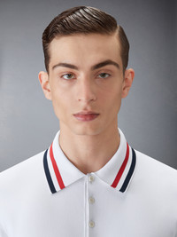 Inspired by East Coast preppy icons, this tennis polo borrows from Thom Browne's very own love of sport. Find our distinct grosgrain trim throughout. Partial front button placket Buttoned side vents with signature striped grosgrain trim Signature striped grosgrain loop tab Model is 6'1" (185cm), wearing size 1 83% Viscose, 17% Polyester Made in Italy MKP136A-Y5502-100