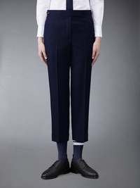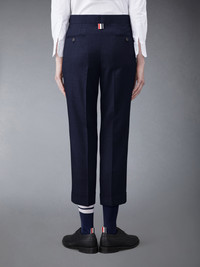 DETAILS & FIT Our Twill Low Rise Slim Trouser. The classic shortened hem pays homage to Thom Browne’s distinguished tailoring. Tab front closure Adjustable buttoned side tabs Creased legs Narrow cuffs Slip side pockets Button-fastening jetted hip pockets Signature striped grosgrain loop tab at back waist Fit 3 Model is 5' 10" (178cm), wearing size 40 100% Wool Lining: 100% Cupro Made in Italy FTC392A-00626-415
