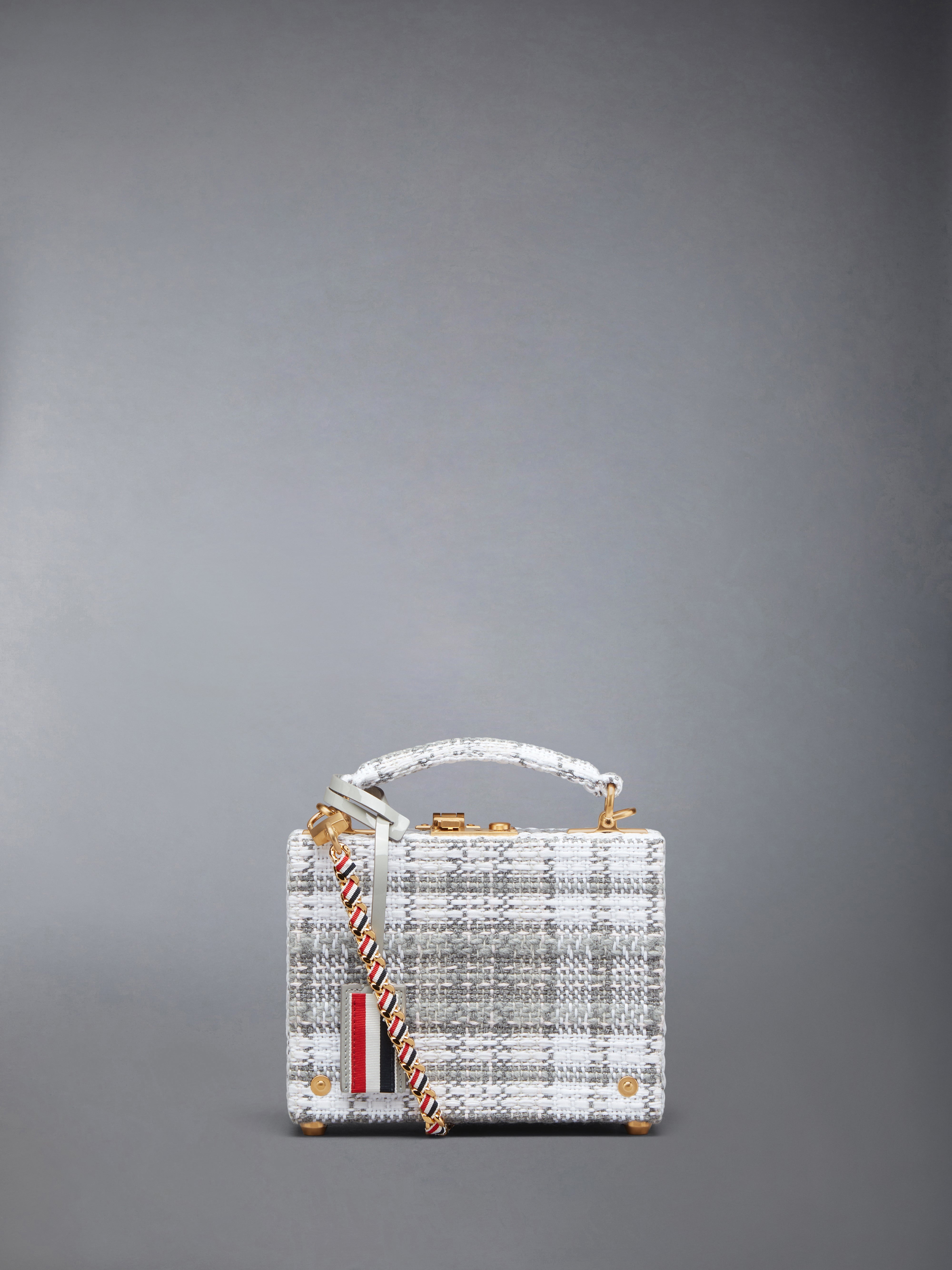 Micro attache case in tartan check tweed with removable woven brass chain and grosgrain ribbon shoulder strap. Locking brass clasp, tweed-covered top handle, striped leather luggage tag. Brass riveted and footed details. Striped lining with interior pocket. Brass hardware. 27% Polyester, 27% Cotton, 22% Wool, 21% Acrylic, 3% Polyamide Combo1:100% Calf Patent Leather Lining:100% Polyester Lining2:100% Lamb Leather Made in Italy FAP191A-07492-035
