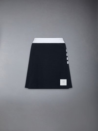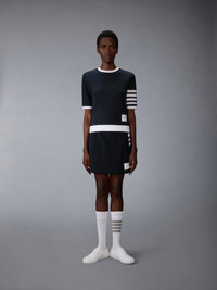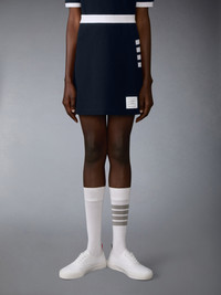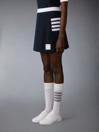 Rooted in uniform tradition, this mini skirt refines a classic silhouette through the Thom Browne lens. Defined by structured box pleats and signature 4-bar detailing, it brings a sense of order to everyday dressing—disciplined, direct, and unmistakably part of the vocabulary. Box pleats 4-bar detailing Name tag applique Signature striped grosgrain loop tab Model is 5'10" (178 cm), wearing size 62 100% Cotton Made in Italy FJK146A-J0248-415