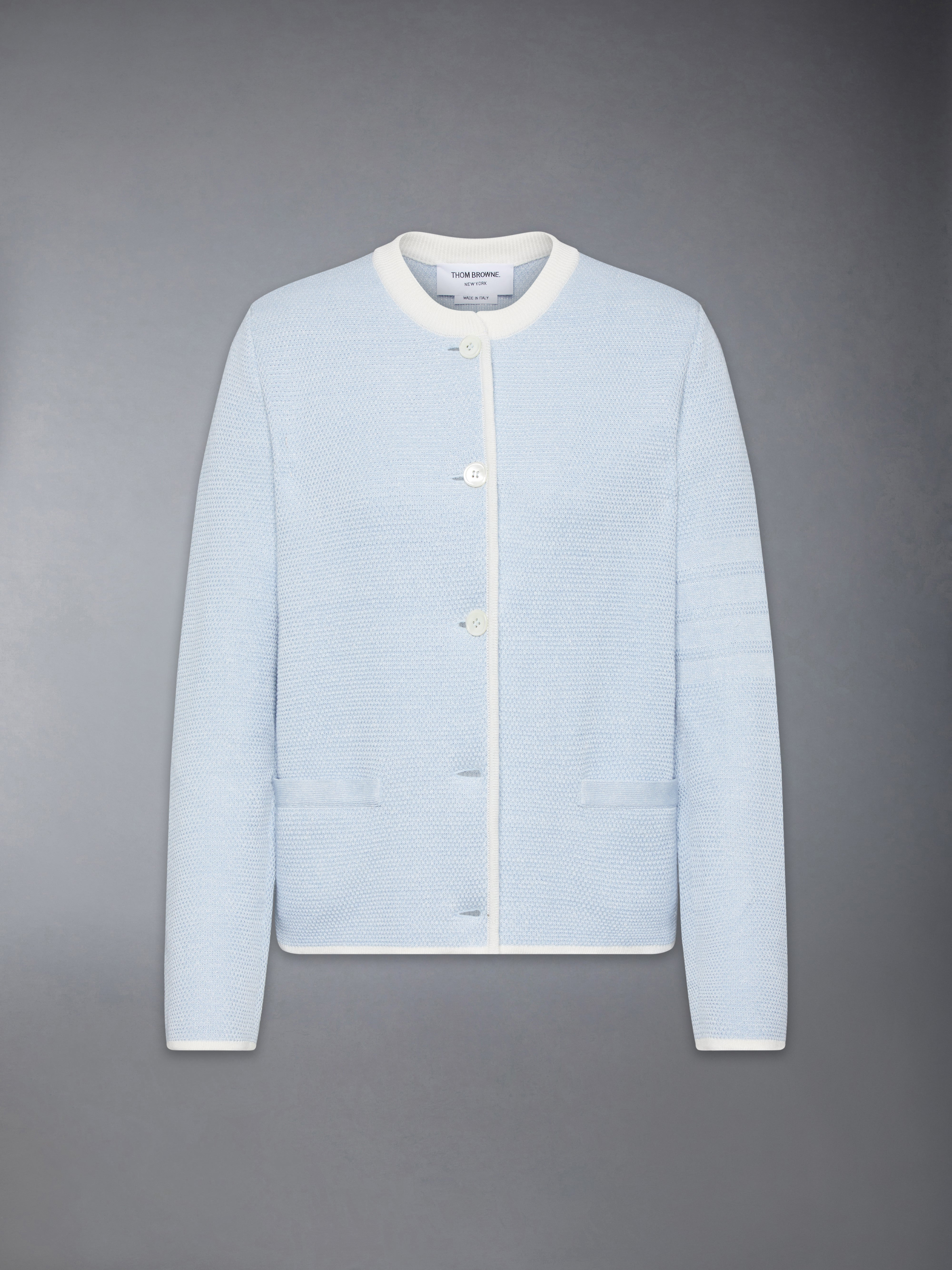 Inspired by the charm of classic American country life and the beauty of simple joys, this linen cotton cardigan features discreet 4-bar detailing on the left sleeve and two functional pockets. Pair it with our Denim Unlined Bermuda Shorts. Front button closure 4-bar detailing 2 Front slip pockets Signature striped grosgrain loop tab Model is 5'10" (178 cm), wearing size 40 68% Linen, 32% Cotton Made in Italy FKJ115B-Y6011-480