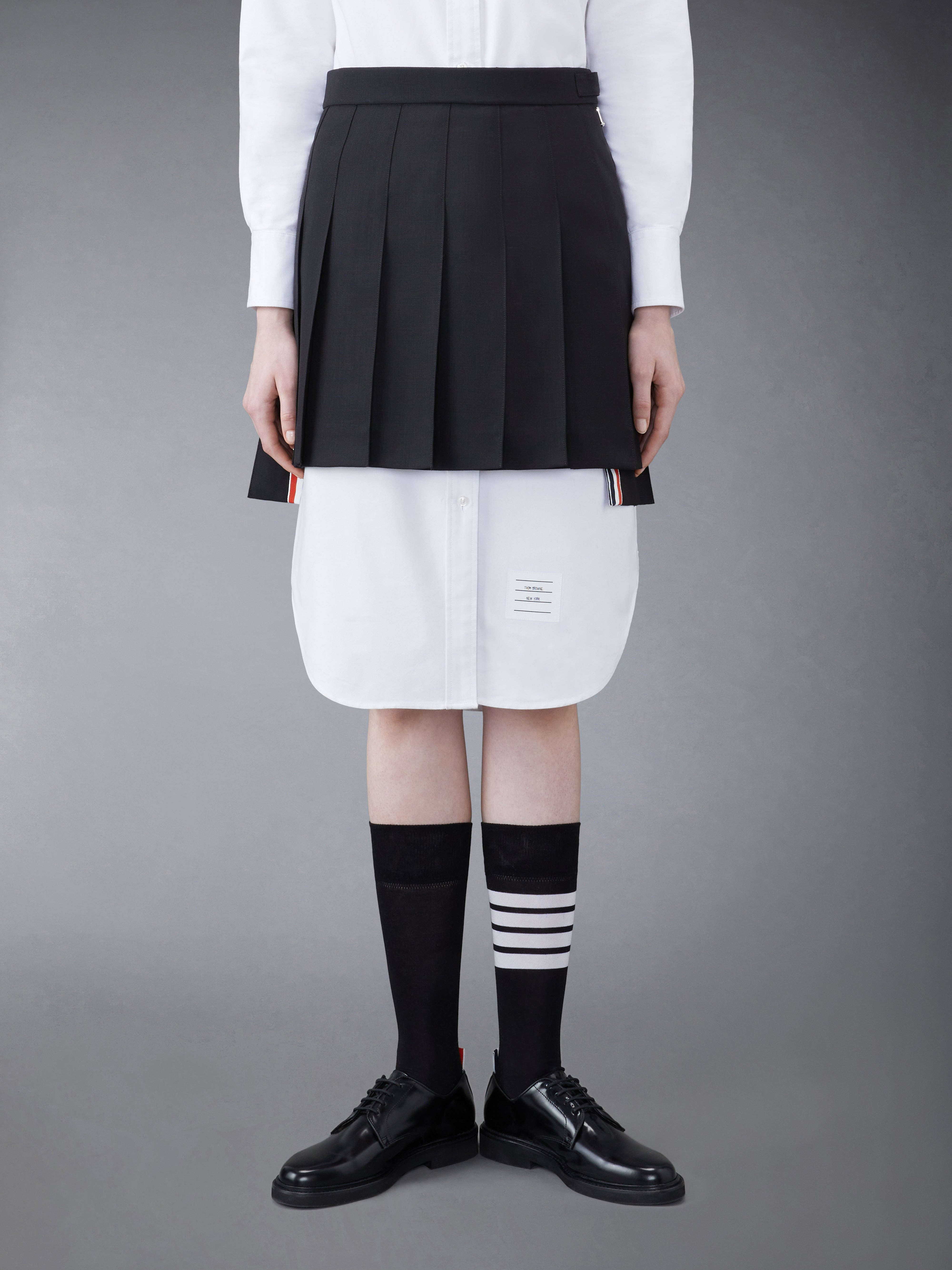 DETAILS & FIT Inspired by East Coast preppy icons, our Wool Fresco Pleated Mini Skirt is a fresh take on a classic silhouette. Pair with our Fresco High Armhole Sport Coat. Side zip closure Adjustable button backstrap Dropped back hem with signature grosgrain trim Signature striped grosgrain loop tab at back waist Model is 5' 10" (178cm), wearing size 40 100% Wool Lining: 100% Cupro Made in Italy FGC402V-00473-001