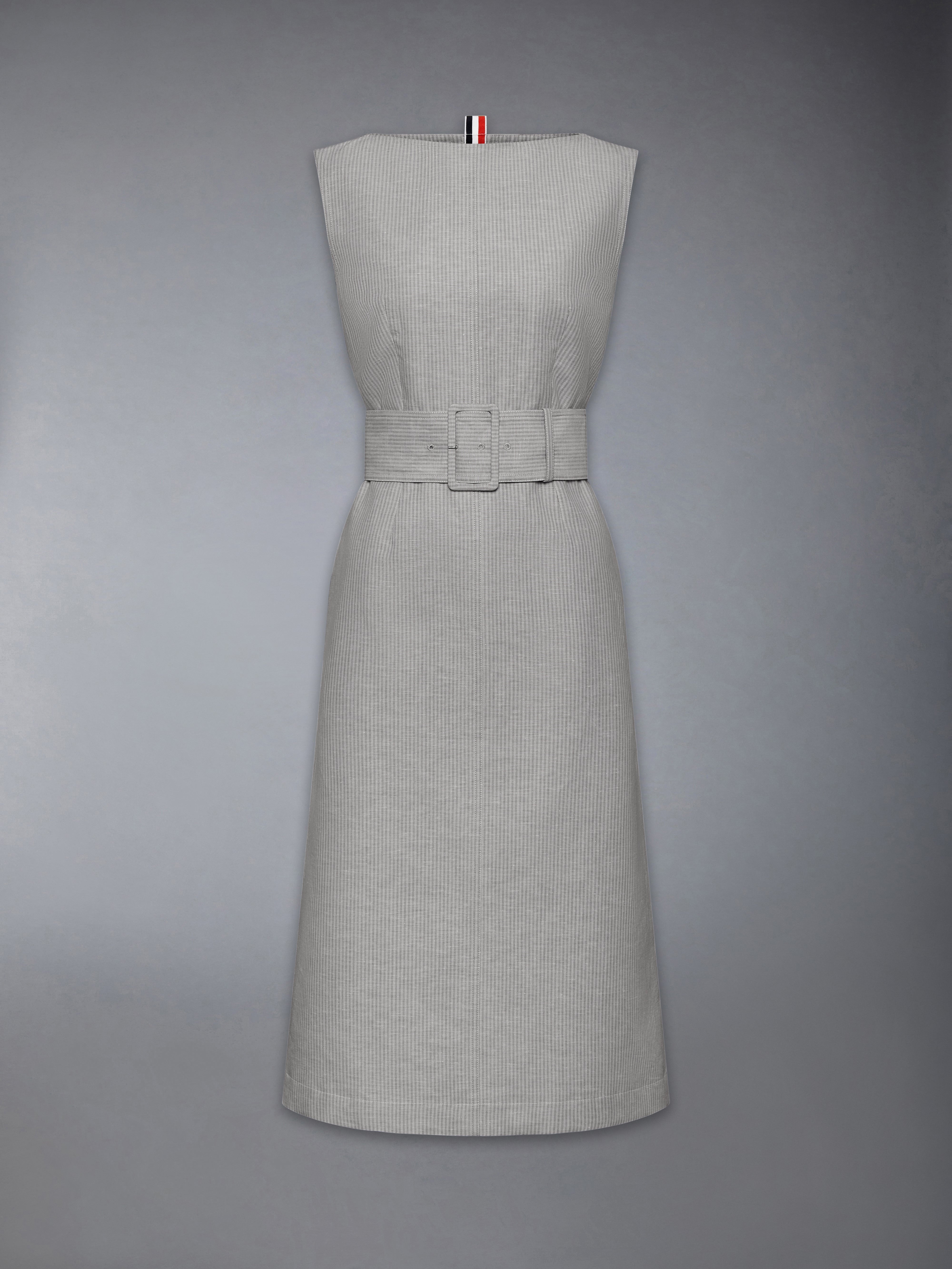 A reiteration of the iconic Thom Browne dress worn by a Grammy Award-winning and Oscar-nominated singer-actress to the 2024 Paris Olympic Games. This timeless piece seamlessly blends classic style with modern sophistication, perfect for transitioning from office to evening. It’s a wardrobe staple that will never go out of style—a true classic for any occasion. Back zip closure Belted waist Hidden pockets Signature striped grosgrain loop tab Model is 5'10" (178 cm), wearing size 40 60% Linen, 40% Cotton Lining: 100% Silk Made in Italy FDSF25A-F0940-055 FDSF25A-F0940-055