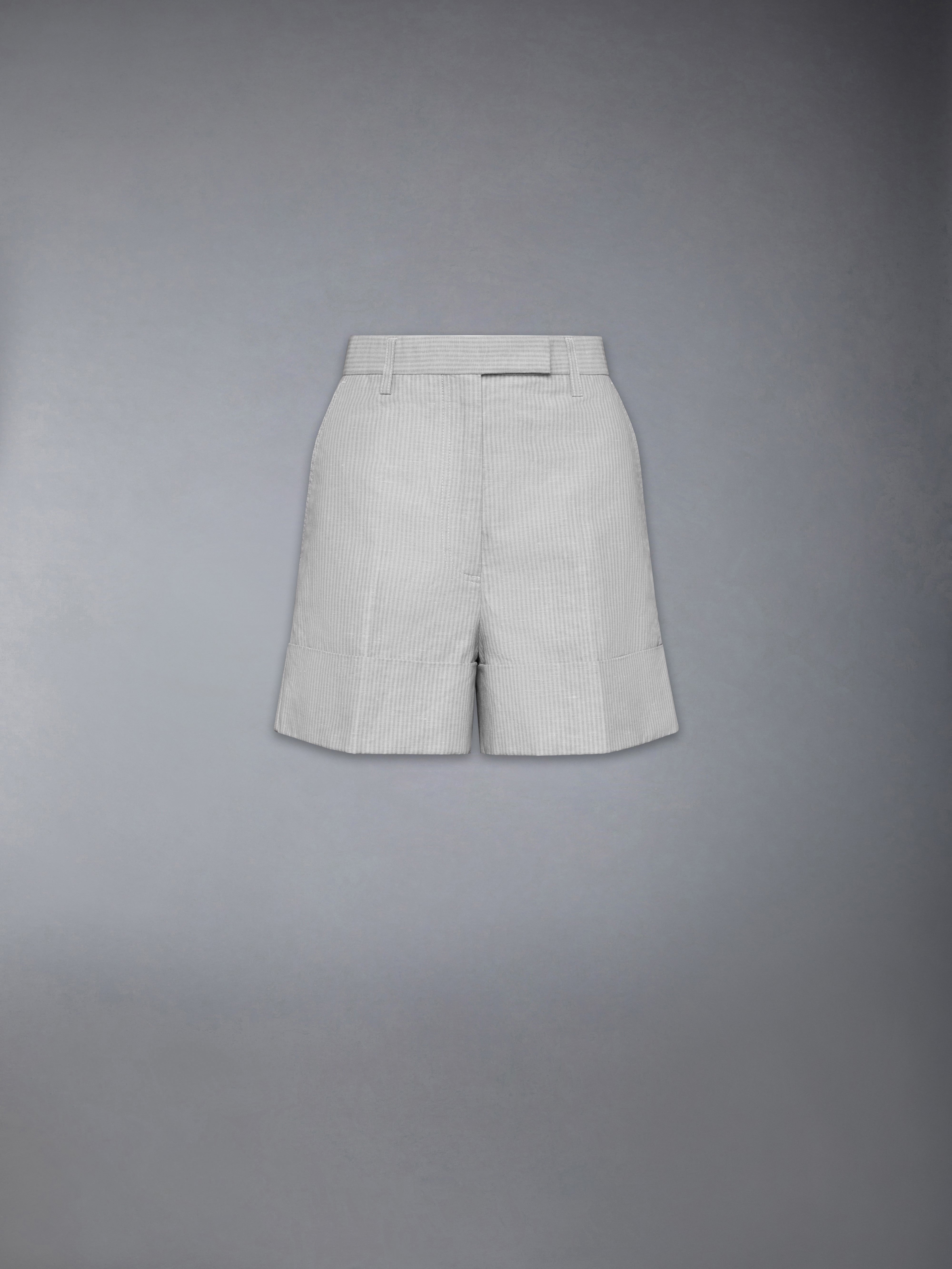 Inspired by 19th-century work uniforms, these pinstripe tailored shorts feature a single, subtle Thom Browne emblem at the rear. Pair them with our Stripe Linen Cotton Cropped Sack Patch Pocket Sport Coat to complete the look. Tab front closure Button-fastening back welt pockets Signature striped grosgrain loop tab Fit 2 Model is 5'10" (178 cm), wearing size 40 60% Linen, 40% Cotton Lining: 100% Cupro Made in Italy FTC436A-F0940-055 FTC436A-F0940-055