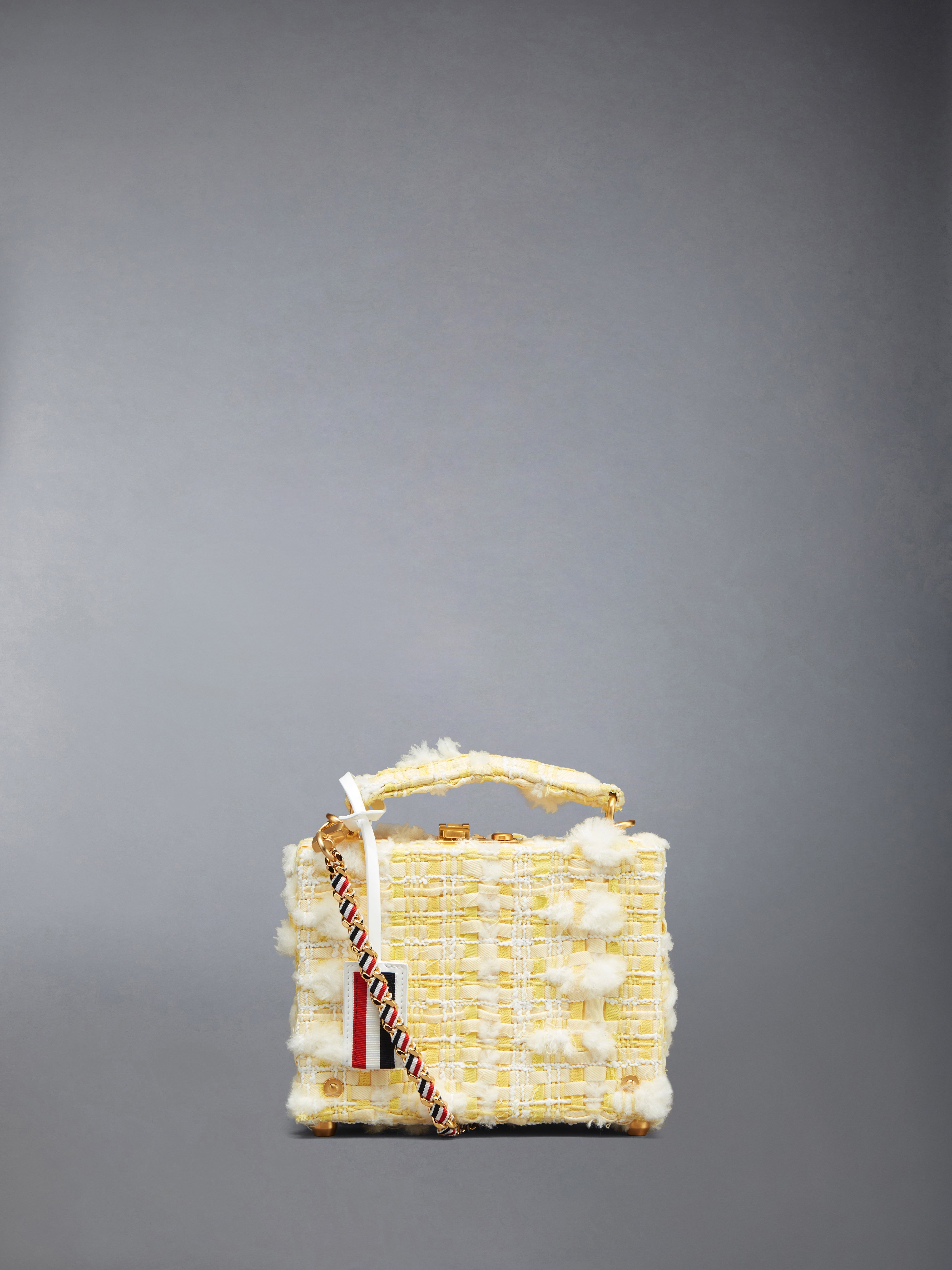 Micro attache case in yellow and white cotton twill pouf tweed with removable woven brass chain and grosgrain ribbon shoulder strap. Locking brass clasp, tweed-covered top handle, striped leather luggage tag. Brass riveted and footed details. Striped lining with interior pocket. Brass hardware. 67% Cotton, 11% Acrylic, 11% Polyester, 8% Virgin Wool, 3% Polyamide Combo1:100% Calf Patent Leather Lining:100% Polyester Lining2:100% Lamb Leather Made in Italy FAP191A-F0292-740
