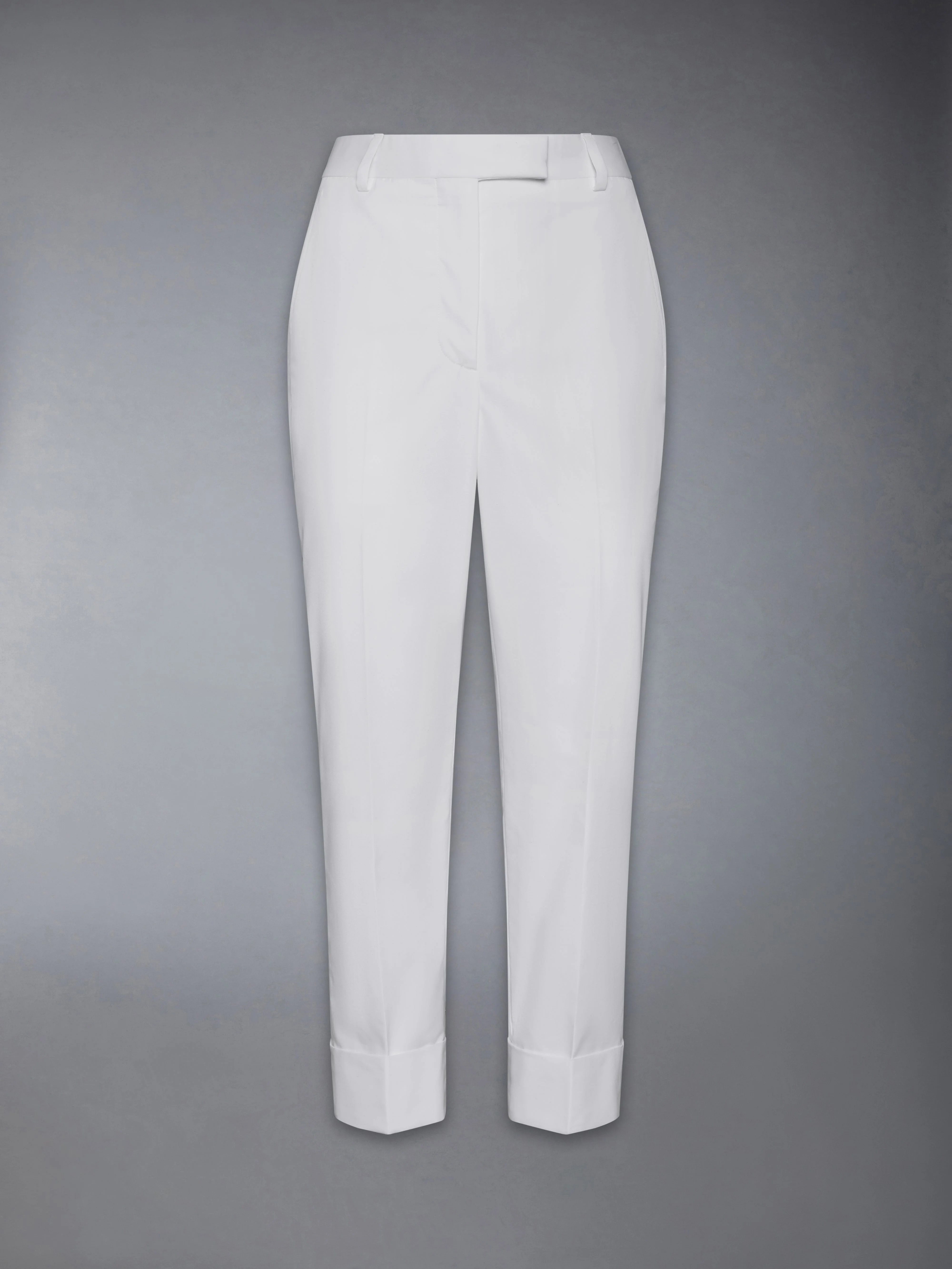 DETAILS & FIT A sophisticated trouser with a shortened hem that pays homage to Thom Browne’s distinguished tailoring. Tab front closure Side slip pockets Button-fastening back welt pockets Signature striped grosgrain loop tab Model is 5'10" (178 cm), wearing size 40 65% Polyester, 35% Cotton Lining: 100% Cupro Made in Italy FTC502A-04502-100