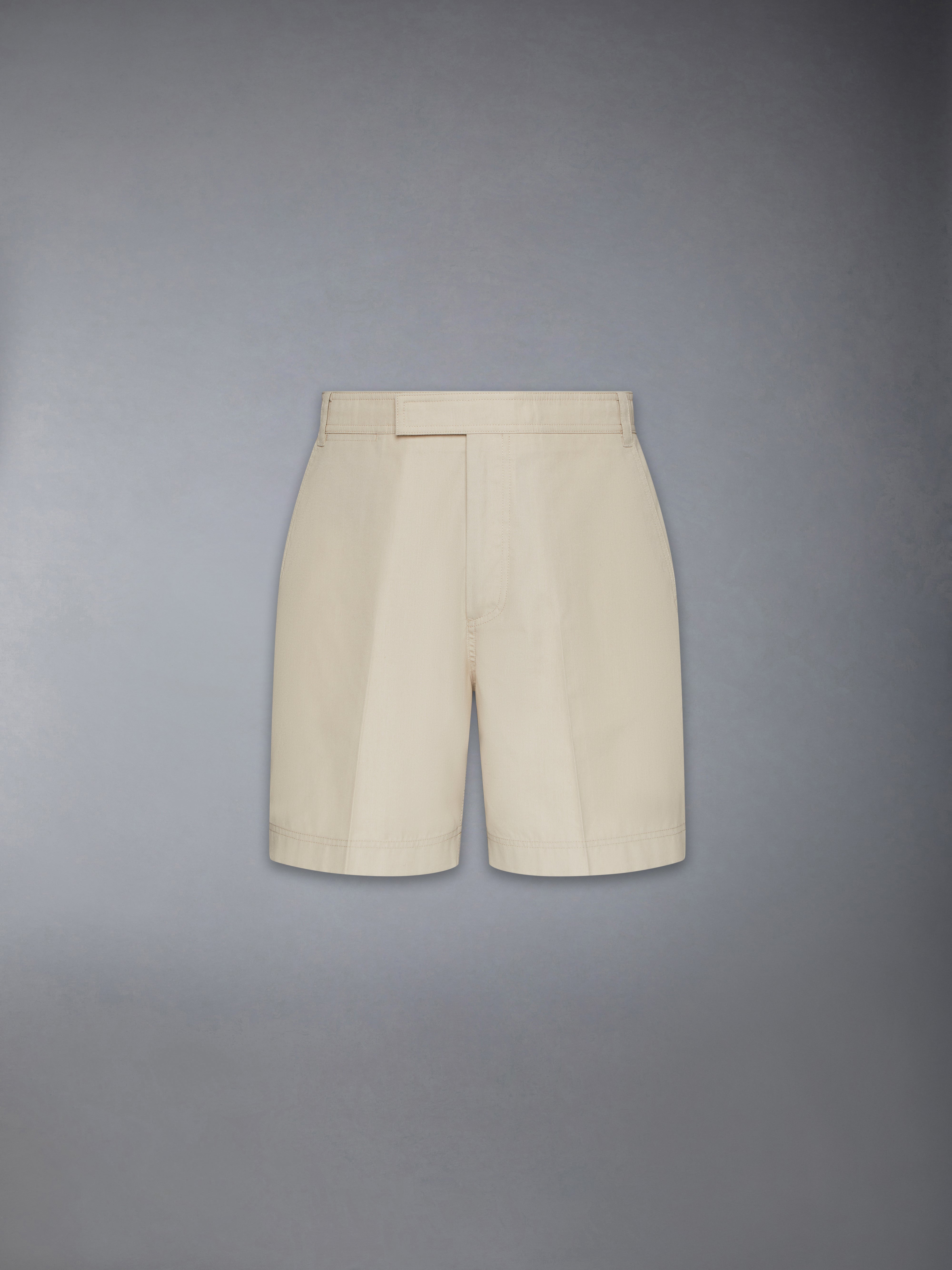 DETAILS & FIT Impeccable craftsmanship, fine fabric, and distinctive Thom Browne emblems make these dress shorts an essential garment for your seasonal wardrobe. Pair them with any of our oxford shirts or casual tees. Tab front closure Button-fastening back welt pockets Signature striped grosgrain loop tab Model is 6'1" (185cm), wearing size 1 65% Polyester, 35% Cotton Made in Italy MTU338S-04502-250