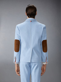 Inspired by preppy American country life, this relaxed sport coat in sky blue denim is accented with rich suede elbow patches, elevating a casual piece to one of elegance. Complete the suit with our Denim Backstrap Trousers for a refined yet relaxed ensemble. Front button closure 2 Front flap pockets Single chest pocket Interior pocket with name tag Signature striped grosgrain loop tab Model is 6'1" (185cm), wearing size 1 100% Cotton Combo 1: 100% Bovine Leather Lining: 100% Cotton Lining 2: 100% Cupro Made in Italy MJU558C-F0950-480 MJU558C-F0950-480