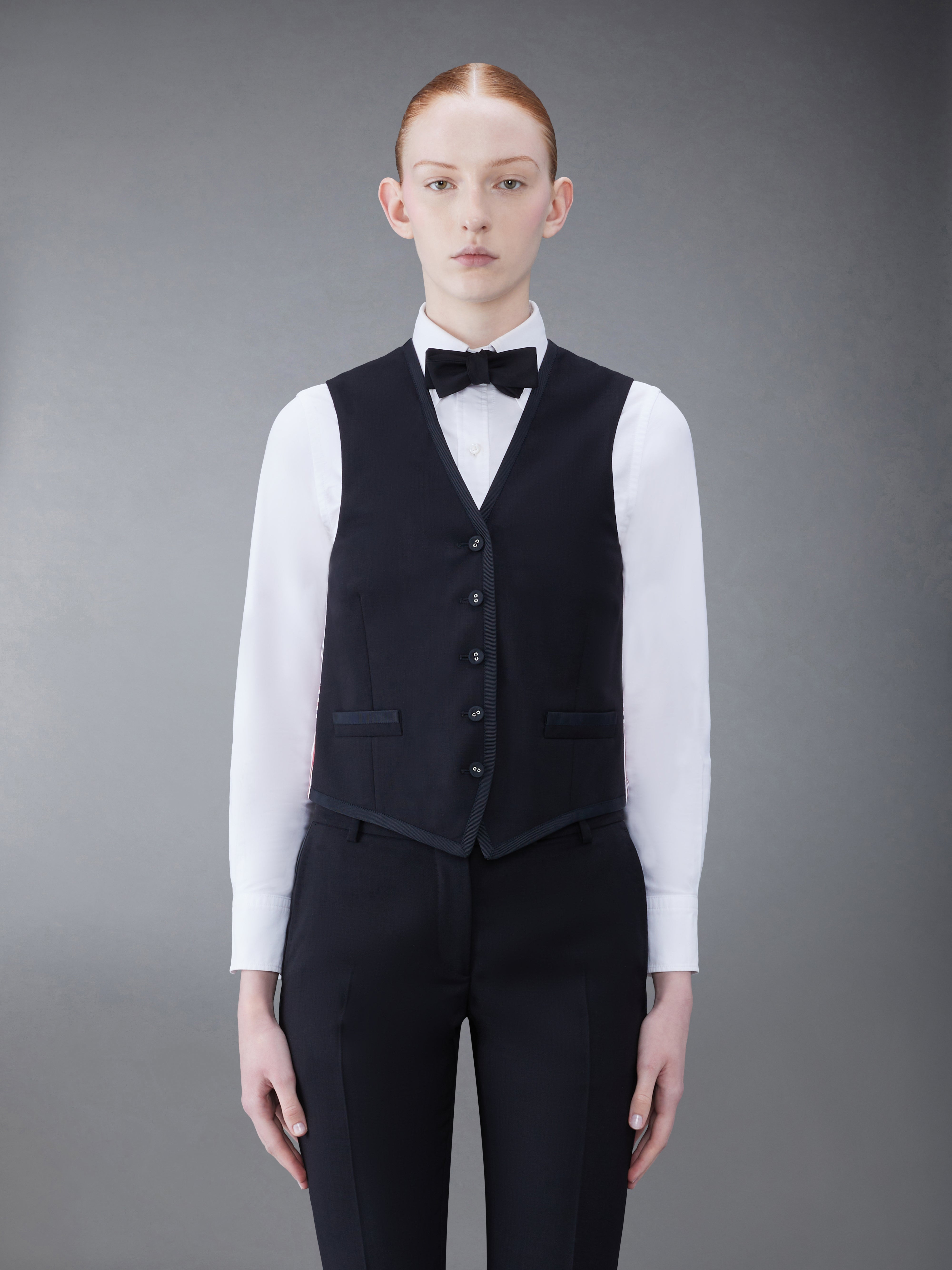 DETAILS & FIT A buildable layer that adds a touch of sophistication to any shirt underneath. V-neckline Front button closure Striped back panel Adjustable Buttoned backstrap Signature striped grosgrain loop tab Model is 5'10" (178 cm), wearing size 40 100% Wool Lining: 100% Cupro FVC004B-00473-001