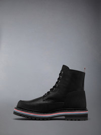 Thom Browne’s iconic hiking sole is reimagined in a rugged yet elevated all-terrain boot. Crafted in supple calf leather, the silhouette is defined by molded rubber ribbing along the upper and finished with signature tricolor striping at the welt. A study in contrast and control—engineered for durability, grounded in design. Lace-up closure Ribbed mudguard Tricolor welt stripes Lug sole Signature striped grosgrain loop tab Upper: 100% Calf Leather Sole: 100% Rubber Lining: 100% Calf Leather Made in Italy MFB253H-05584-001