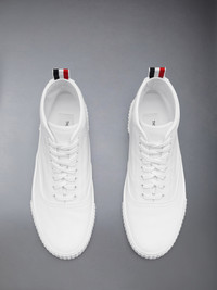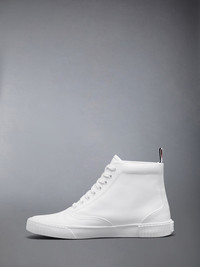 Thom Browne’s take on the classic high-top silhouette—sleek, refined, and built for all-day comfort. Featuring a crisp, clean body and a padded sole, these sneakers blend style with wearability. Lace up Vulcanized sole Signature striped grosgrain loop tabs at heels Upper: 100% Calf Leather Sole: 100% Rubber Lining: 100% Calf Leather Made in Italy FFE010B-05584-100