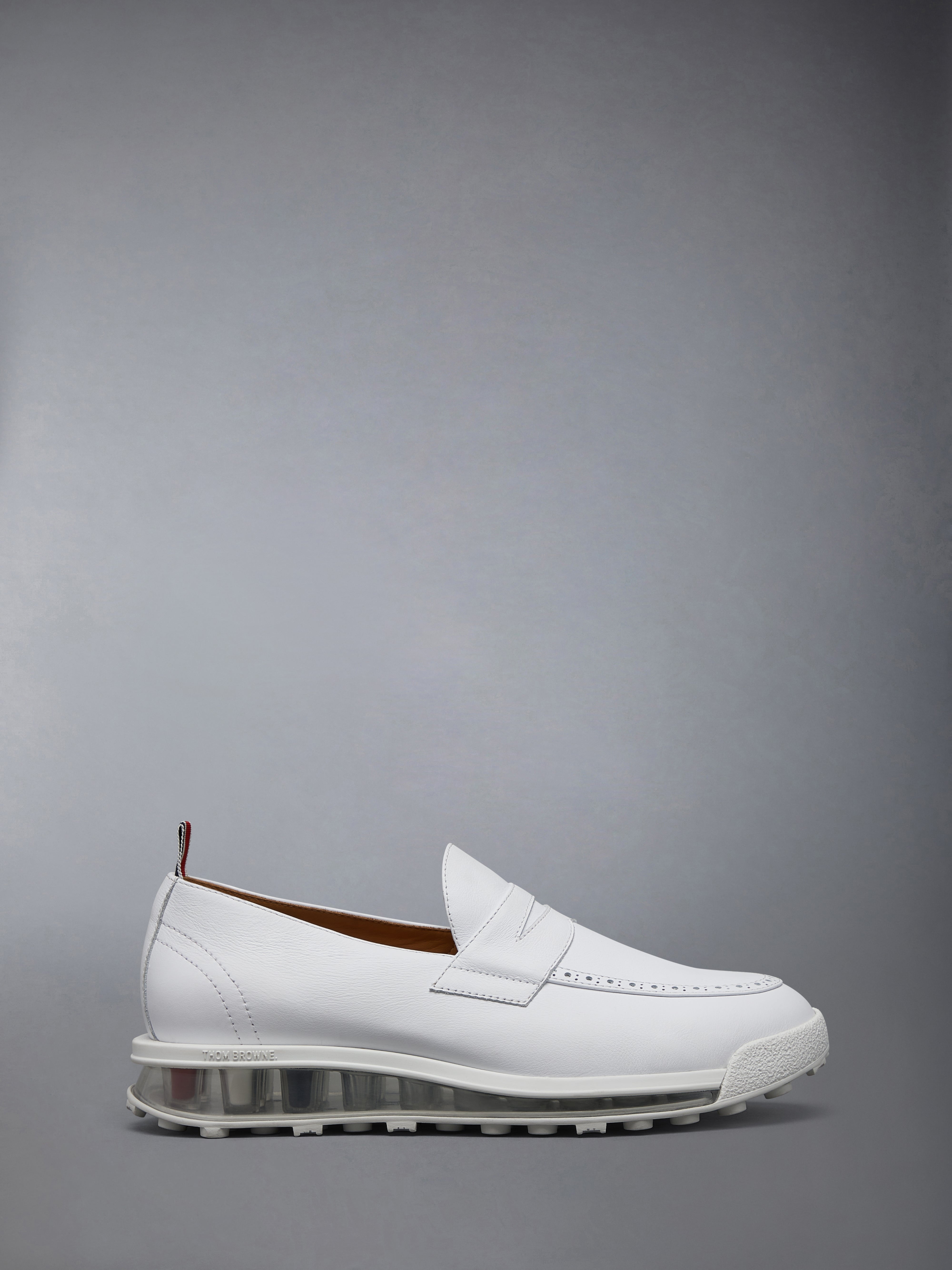A cross between a penny loafer and a running shoe, these comfortable slip-ons were crafted for all-day wear. Pair them with our Washed Cotton Utility Cargo Trousers. Slip on Tech runner sole Signature striped grosgrain loop tabs at heels Upper: 100% Calf Leather Sole: 100% Rubber Lining: 100% Calf Leather Made in Italy MFE008B-05584-100