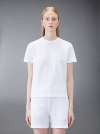 DETAILS & FIT A silhouette that has stood the test of time, our Classic Pique Stripe Tee is adorned with signature Thom Browne emblems throughout and tailored to perfection. Crew neckline Name tag applique above hem Center back stripe detail Buttoned side vents with signature striped grosgrain trim Signature striped grosgrain loop tab at back of neck Model is 5' 10" (178cm), wearing size 40 100% Cotton Made in Italy FJS013A-00050-100 - SLEEVE LENGTH: 5.0cm - Shoulder Width: 40.0cm - Length: 62.0cm - WAIST: 93.0cm - BUST: 93.0cm