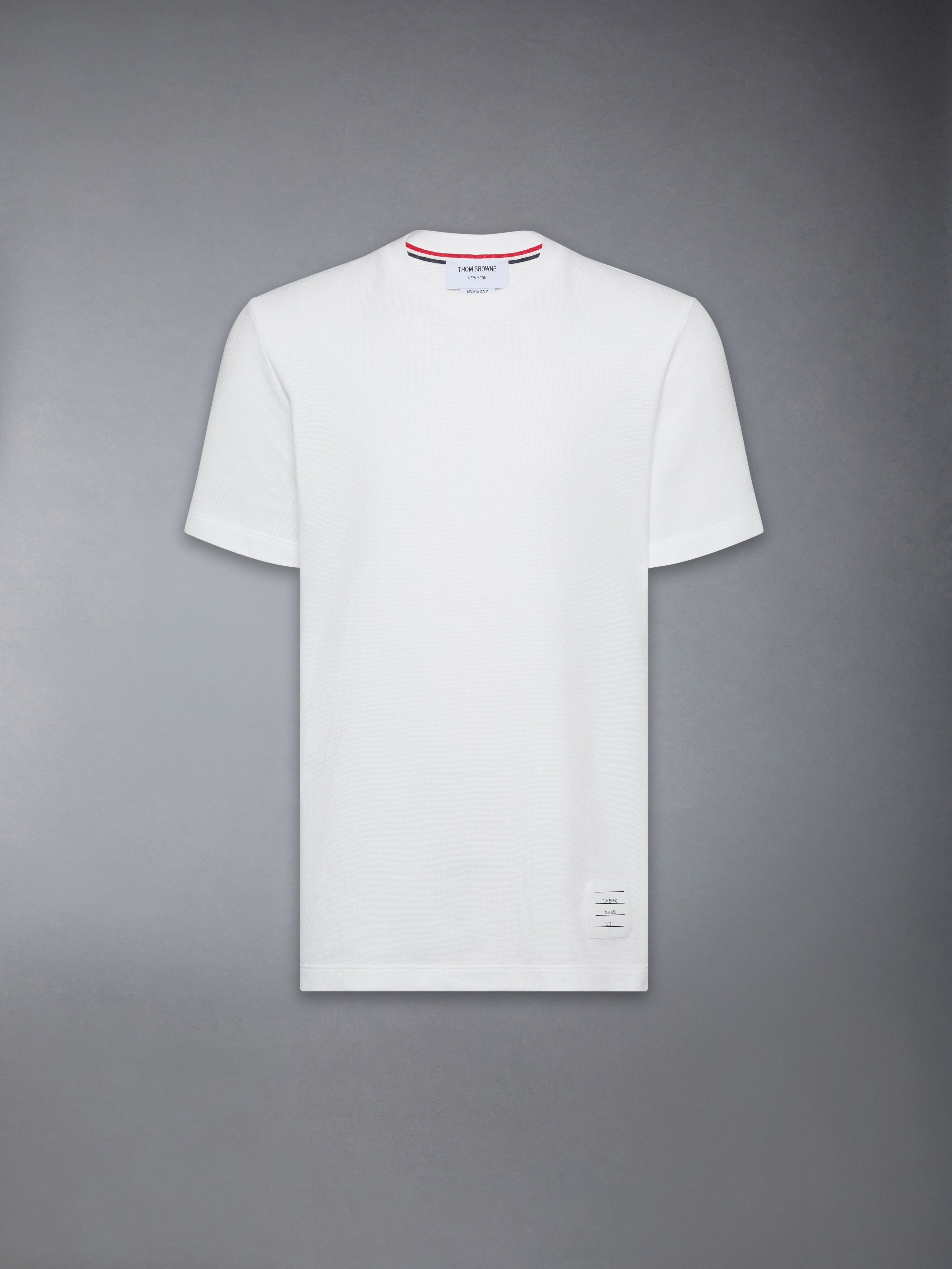 DETAILS & FIT A silhouette that has stood the test of time, our Classic Pique 4-Bar Tee is adorned with signature Thom Browne emblems throughout, and tailored to perfection. Crew neckline 4-bar stripe detail at left side Name tag applique above hem Signature striped grosgrain loop tab at back of neck Model is 6' 1" (185cm), wearing size 0 100% Cotton Made in Italy MJS123A-00050-100