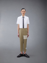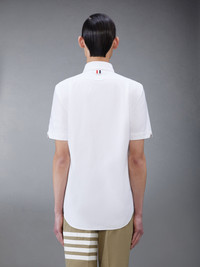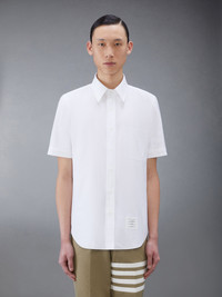 DETAILS & FIT A Thom Browne essential, our Oxford 4-Bar Short Sleeve Shirt exhibits quality craftsmanship and meticulous tailoring. Front button closure Single chest pocket 4-bar stripe detail at left sleeve Name tag applique above hem Signature striped grosgrain loop tab Model is 6' 1" (185cm), wearing size 1 100% Supima Cotton Made in Italy MWS239A-06496-100