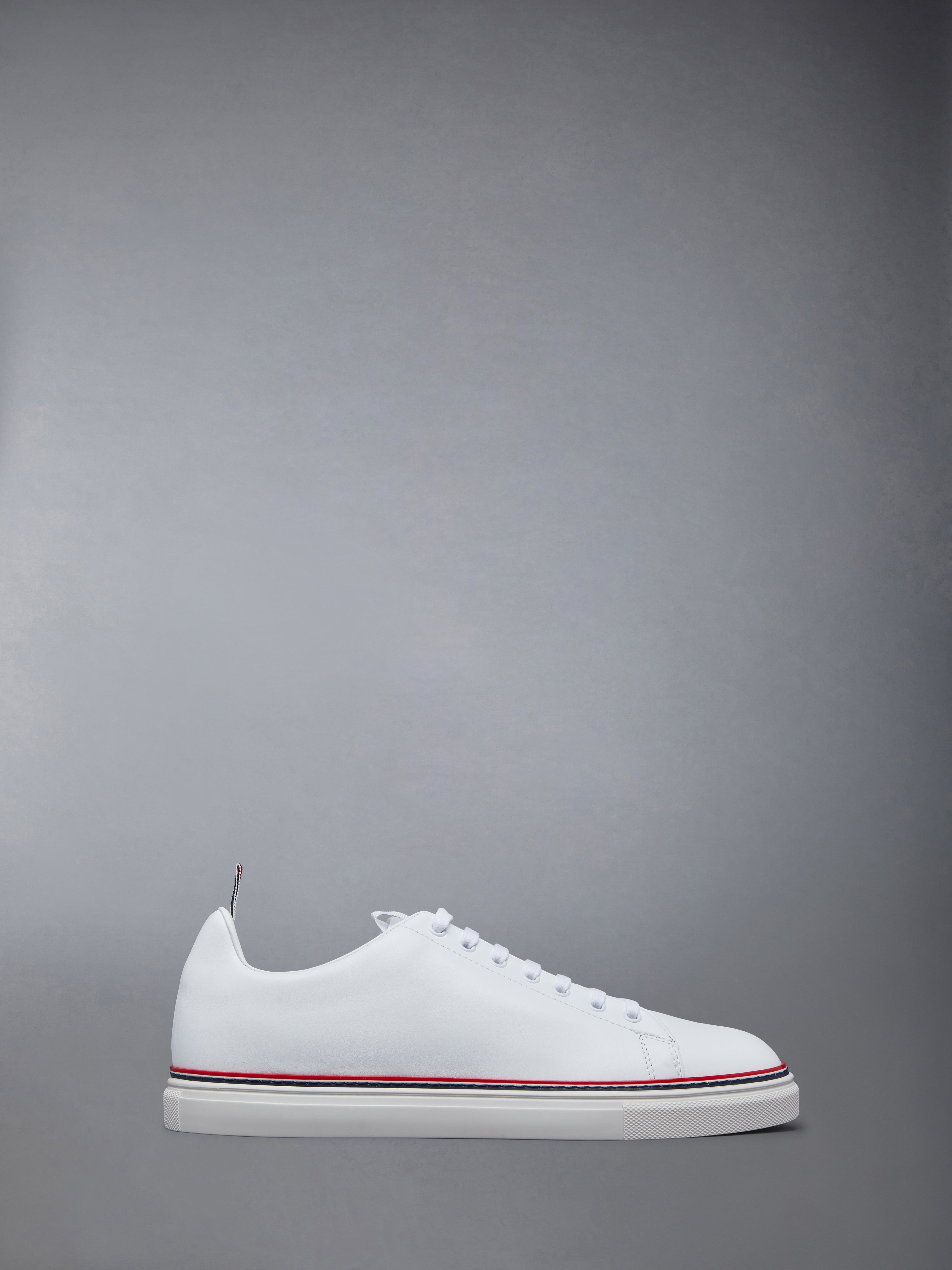 DETAILS & FIT Leisurewear made artful. Our Vitello Calf Tennis Shoe draws inspiration from Thom's passion for sport. Find our signature grosgrain trim at the rear. Lace up closure Rubber sole Leather lining Signature striped grosgrain loop tabs at heels Upper: 100% Calf Leather Sole: 100% Rubber Lining: 100% Calf Leather Made in Italy MFD219A-05584-100