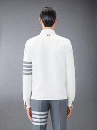 DETAILS & FIT Two Thom Browne emblems define our Cotton Crepe V-neck Cardigan—grosgrain trim and 4-Bar stripe detailing, both synonymous with the brand. V-neckline Front button closure with striped grosgrain placket 4-bar stripe detail at left sleeve Buttoned side vents and cuffs with signature striped grosgrain trim Signature striped grosgrain loop tab at back of neck Buttoned side vents and cuffs with signature striped grosgrain trim Center stripe through back and hood Model is 6' 1" (185cm), wearing size 1 100%Cotton Made in Italy MKC171A-00219-100