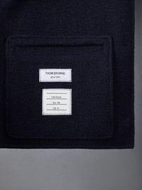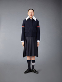 DETAILS & FIT This luxurious jacket is the pinnacle of cold weather sophistication, adorned with Thom Browne signature grosgrain armbands and a warm shearling collar. Hidden front closure 2 flap pockets Interior name tag Signature striped grosgrain armbands with buttons Detachable shearling collar Signature striped grosgrain loop tab Model is 5'10" (178 cm), wearing size 40 90% Wool, 10% Cashmere Combo1: 100% Shearling Leather Made in Italy FBC915C-F0656-415