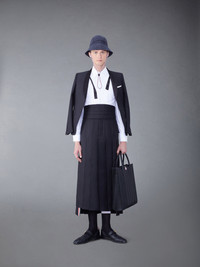 DETAILS & FIT Inspired by East Coast preppy icons but reimagined with inventive proportions and quality craftsmanship, our Classic Twill Pleated Backstrap Skirt in Black is a fresh take on a classic silhouette. Side zip closure Dropped back hem with signature grosgrain trim Adjustable button backstrap Signature grosgrain loop tab at back waist Model is 6' 1" (185cm), wearing size 0 100% Wool Lining: 100% Cupro 0 MGC024A-00170-001