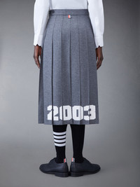 DETAILS & FIT Classic pleated knee length skirt in grey wool flannel with embroidered V-stitch '2003' through back pleats in wool thread. Side zip closure, adjustable buttoned side tabs. Dropped back with signature striped grosgrain trim. Signature striped grosgrain loop tab at back waist. Classic - Fit 1. Model is 5'10" (178 cm), wearing size 40 100% Virgin Wool Combo 1: 50% Wool, 50% Acrylic Lining: 100% Cupro Made in Italy FGC400E-E0707-035