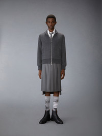 A light jacket made with warm wool fleece and side pockets for functionality. Find our signature grosgrain loop tab at the neck—a subtle touch of Thom Browne branding. Front zip closure Side slip pockets Signature striped grosgrain loop tab Model is 6'1" (185cm), wearing size 1 100% Wool Made in Italy MJT526A-J0100-015