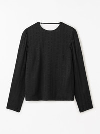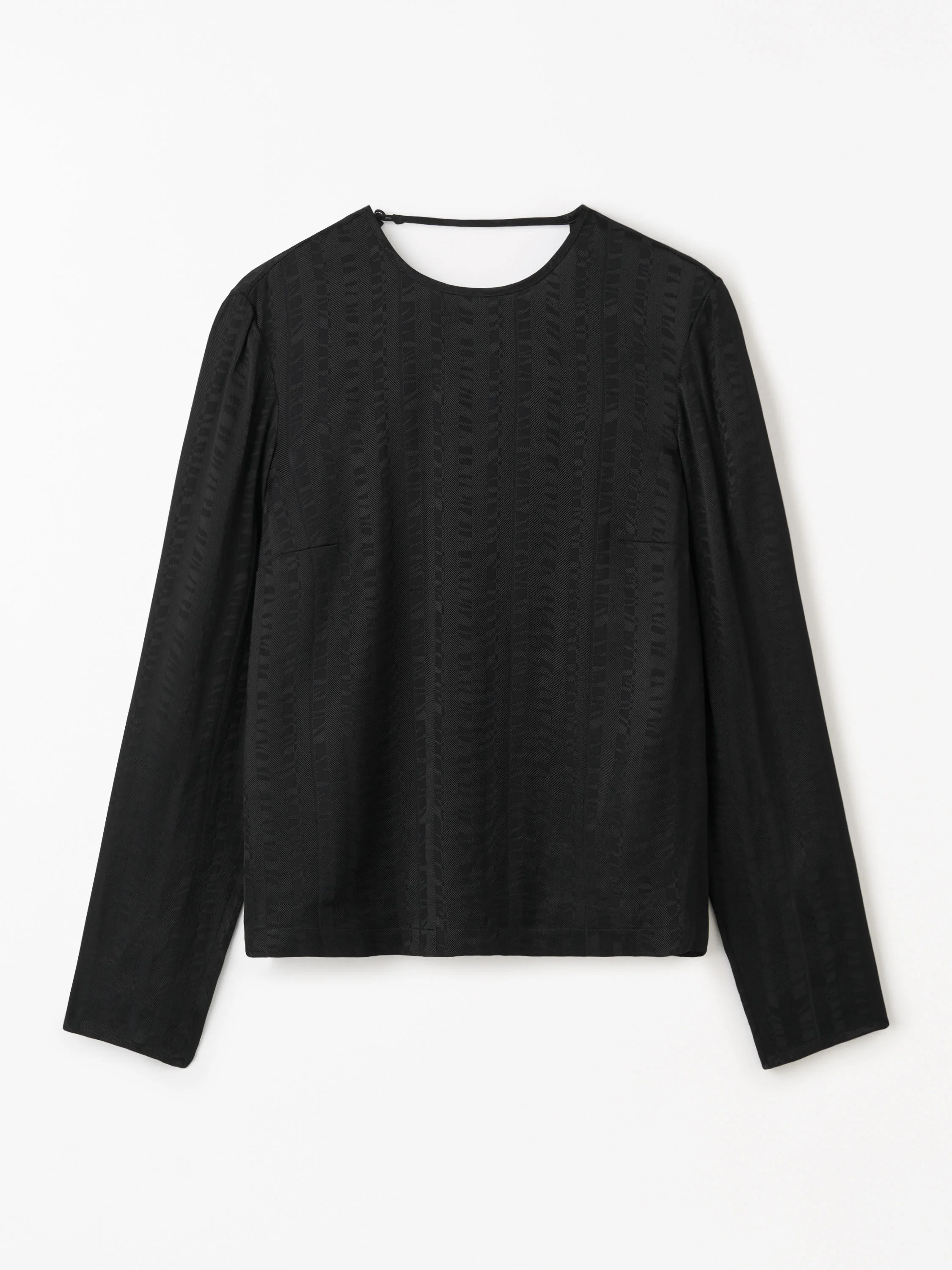 The Amalia is a sleek and regular-fitting long-sleeve top, crafted in a striking Tiger Stripe Jacquard. While the front embraces minimalism with clean lines, the back reveals an elegantly sculpted U-neckline, accentuated by a delicate strap that connects the shoulders for a structured look. A glossy twill trim outlines the neckline, adding a sharp, polished contrast. Amalia can be paired seamlessly with the Cora trousers for a statement set. Product Details - 100% Viscose - Long sleeve blouse in a Viscose Jacquard fabric - Slim-fit silhouette - Regular round neckline at front, and a scooped U-neckline at back with a strap connecting the shoulders - Hip length - Straight hem line - The neckline and neckline strap at back, will be in a shiny twill material for a sharp edge look - Sleeves have a slit at end, with a shell covered button detail as closure - Made in China - Model is 177 cm and wearing a size 36 - For a complete look, wear it with Cora Trousers - Art No.113716050