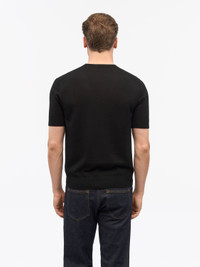 The slim-fit crew-neck is made from 100% Merino wool and features a fine knit with a jersey stitch. It is short-sleeved and has a French shoulder with visible fashioning. The self-double neck trim, along with the rib trimming at the bottom hem and sleeves, adds to its design. The crew neck is hip length. The wool in this product is certified by the Responsible Wool Standard. Product Details - 100% Wool - Merino - Slim fit crewneck in 100% merino - Fine knit - Hip length - Made in China - Model is 186 cm and wearing a size M - Art No.114283050