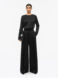 Cora is our new trousers in a relaxed loose fit with a high waist with waistband. They are designed in a drapy printed 100% viscose fabric featuring wide legs with pleats at front. Invisible zipper and hook&eye closure at side with welt pocket at back. They also have a folded high bottom hem. Product Details - 100% Viscose - Trousers in a drapy printed fabric - Relaxed loose fit - Wide leg with pleats at front - Fitted high waist with waistband - Invisible zipper and hook & eye closure at side - Welt pocket at back - Folded high bottom hem - Made in China - Model is 177 cm and wearing a size 36 - For a complete look, wear it with Amalia Shirt and Vesperi Handbag - Art No.113708050