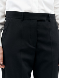 Product Details - 54% Recycled Polyester, 44% Wool, 2% Elastane - Regular Straight Fit - Trousers with tapered leg in full length - Mid waist - Recycled polyester-wool blend with plain weave - Wrinkle resistant, packable fabric - Zip, hook and bar closure - Single welt pockets at back - Slanted pockets at sides - Creases at front and back - Made in Romania - Model is 179 cm and wearing a size 36 - Art No.109796050