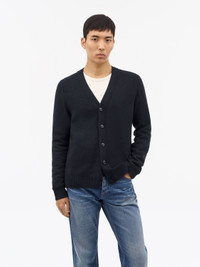 The Eddie cardigan is knitted from 100% Merino wool, offering natural softness, warmth, and breathability. Crafted in a mid-gauge knit, the body and sleeves feature a clean jersey stitch that provides a smooth and refined texture. The front placket is constructed in a full needle stitch, adding subtle structure and visual contrast, and is finished with a classic button closure. The bottom hem and sleeve cuffs are detailed with a 2x2 rib trim, ensuring a snug and comfortable fit. A French shoulder with running stitch detailing adds a tailored, elevated touch, while the hip-length silhouette makes this cardigan a versatile and timeless layering piece. The wool in this product is certified by the Responsible Wool Standard. Product Details - 100% Wool - Merino - Knitted in 100% Merino wool - Mid gauge knit - Body and sleeve are knitted in a jersey stitch - Placket is knitted in a full-needle stitch - Button closure at front - Bottom hem and sleeve cuff are finished with 2x2 rib trim - French shoulder with running stich detail - Hip length - Responsible Wool Standard - Made in China - Model is 186 cm and wearing a size M - For a complete look, wear it with Olaf T-shirt and Marty Jeans - Art No.1132322T6