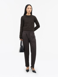 The Elliot trousers are crafted from a semi-drapy midweight fabric that offers both structure and fluidity. Designed with a relaxed fit and a subtly tapered silhouette, they sit comfortably at the mid waist for a modern yet timeless look. The front features a clean finish, while the back is detailed with practical belt loops. A zip fly with a hook-and-bar closure ensures a secure and sleek fastening. Thoughtful design elements include welt pockets at the front, neatly pressed pleats, and sharp crease lines along both the front and back, adding a refined, tailored touch to this versatile wardrobe staple. Product Details - 65% Triacetate, 35% Elastomultiester - Trousers in a semi-drapy midweight fabric - Relaxed fit with slightly tapered silhouette - Mid waist with clean finish at front and waistband with belt loops at back - Fly with zipper and hook&bar closure at front - Welt pockets at front - Pleats at front - Crease lines at front and back - Made in China - Model is 177 cm and wearing a size 36 - To complete the look, wear it with Marie Sweater and Conci Bag - Art No.11339303H