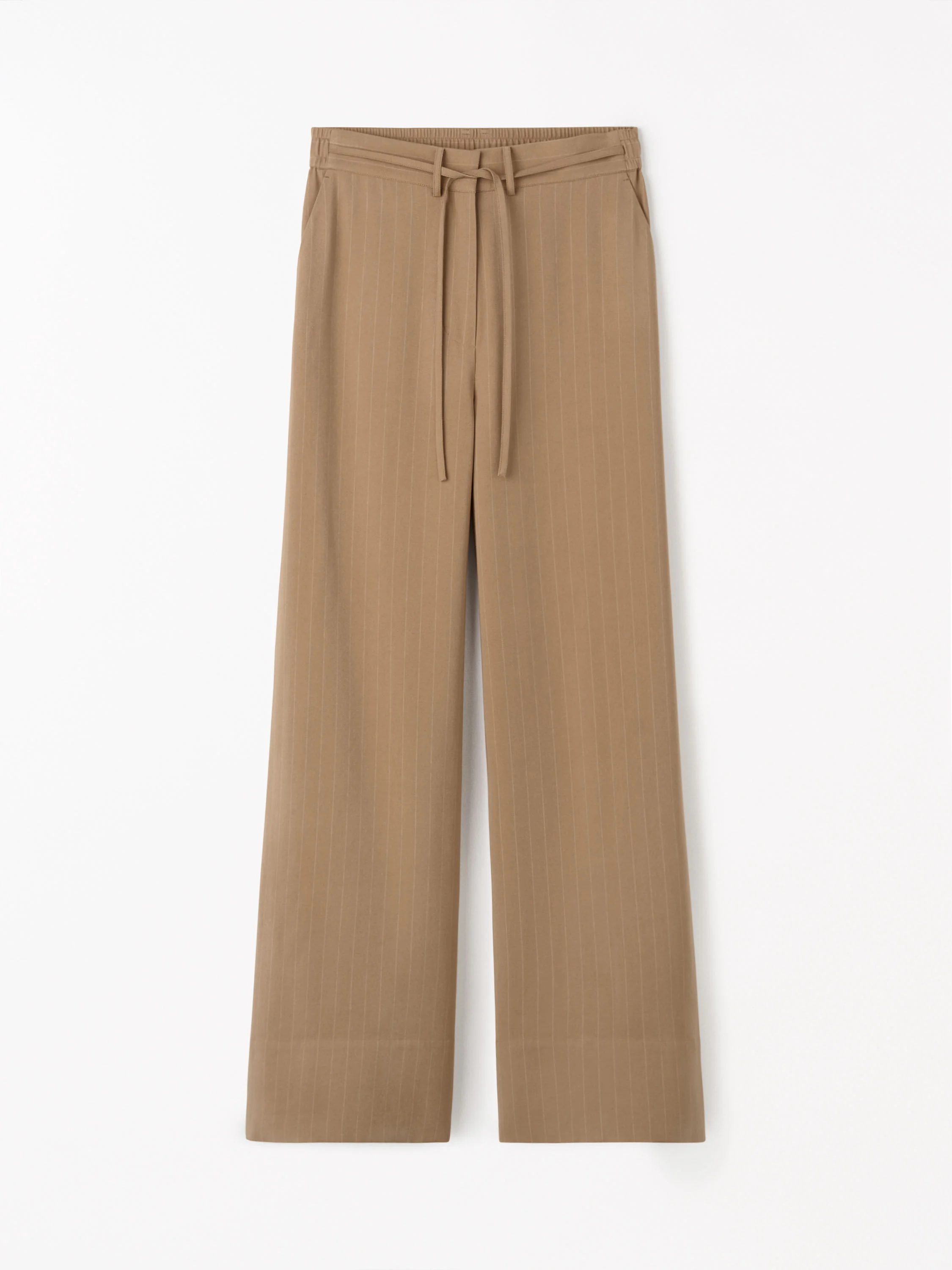 These trousers are made from a tailored, drapey midweight fabric that combines structure with ease. Featuring a relaxed fit and a subtly flared silhouette, they sit at a mid waist with an elasticated back for added comfort. The front is finished with a zip fly and a hook-and-bar closure, while attached tie straps and belt loops at the waist offer adjustable styling. Slanted front pockets and welt pockets at the back provide functional detailing, and the high folded hem adds a refined, contemporary touch. Product Details - 91% Viscose (LENZING (TM) ECOVERO (TM) ), 8% Polyamide, 1% P olyester - Trousers in a tailored drapy midweight fabric - Relaxed fit with slightly flared silhouette - Mid waist with elasticated back part for comfort - Fly with zipper and hook & bar closure at front - Attached tie straps and beltloops at front waist - Slanted front pockets - Welt pockets at back - Folded high bottom hem - Made in China - Model is 177 cm and wearing a size 36 - For a complete look, wear it with Felix Shirt - Art No.1137181Z4
