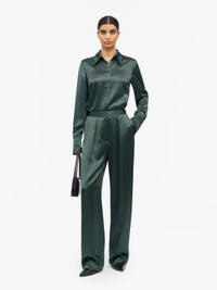 The Inga trousers are made from a Naia acetate satin blend. Naia acetate is a sustainable, bio-based cellulose acetate fibre, offering a luxurious feel and eco-friendly solution. The Inga trousers feature a relaxed straight fit with soft front pleats that add both comfort and a contemporary edge to the silhouette. Crafted from a heavy, satin with a rich handfeel, they bring a subtle sophistication to everyday wear. Available in Army Petrol, they pair perfectly with the Daphne shirt for an effortlessly chic dress-down evening look. Product Details - 75% Acetate, 25% Polyester - Relaxed straight fit trouser in a satin fabric - Mid-waist design - Relaxed straight-leg shape - Wide waist band - Fly zip with hook-and-bar closure at front - Pleat and crease line details at front - Crease-line detail at back - Slanted pockets at side seams and welt pockets at back - Made in Italy - Model is 177 cm and wearing a size 36 - For a complete look, wear it with Daphne Shirt and Zoka Pumps and Vesperi Handbag - Art No.11369731E