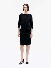 Product Details - 69% Viscose, 26% Polyamide, 5% Elastane - Slim Fit - Draped dress in compact stretch-jersey - Slightly dropped shoulders with three-quarter length sleeves - Above-knee length - Concealed zip closure - Draping at waist - Fully lined - Made in Romania - Model is 179 cm and wearing a size 36 - Art No.109786050