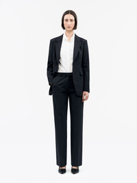 Product Details - 54% Recycled Polyester, 44% Wool, 2% Elastane - Slim Straight Fit - Trousers with mid-waist and straight leg - Recycled polyester wool blend with plain weave - Wrinkle resistant, packable fabric - Zip, hook and bar closure - Slanted pockets at front - Welt pockets at back - Made in Romania - Model is 179 cm and wearing a size 36 - Art No.109798284