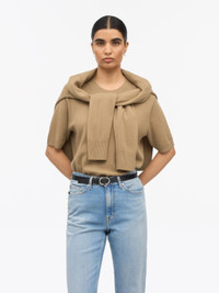 The May T-shirt is knitted from a soft and luxurious Wool-Cashmere blend yarn, offering both warmth and comfort. It features a fine gauge knit with the body and sleeves constructed in a smooth jersey stitch. The neckline, bottom hem, and sleeve cuffs are finished with a classic 2x2 rib trim, providing subtle texture and structure. Designed to sit at hip length, this piece combines timeless style with everyday ease. The wool in this product is certified by the Responsible Wool Standard. Product Details - 90% Wool - Merino, 10% Cashmere - T-shirt knitted in a Wool and Cashmere blend yarn - Fine gauge knit - Body and sleeves are knitted in a jersey stitch - Neckline, bottom hem and sleeve cuff is finished with 2x2 rib trim - Hip length - Responsible Wool Standard - Made in China - Model is 177 cm and wearing a size S - For a complete look, wear it with Maggie Moritz Jeans and Liqua Belt - Art No.1132271Z4