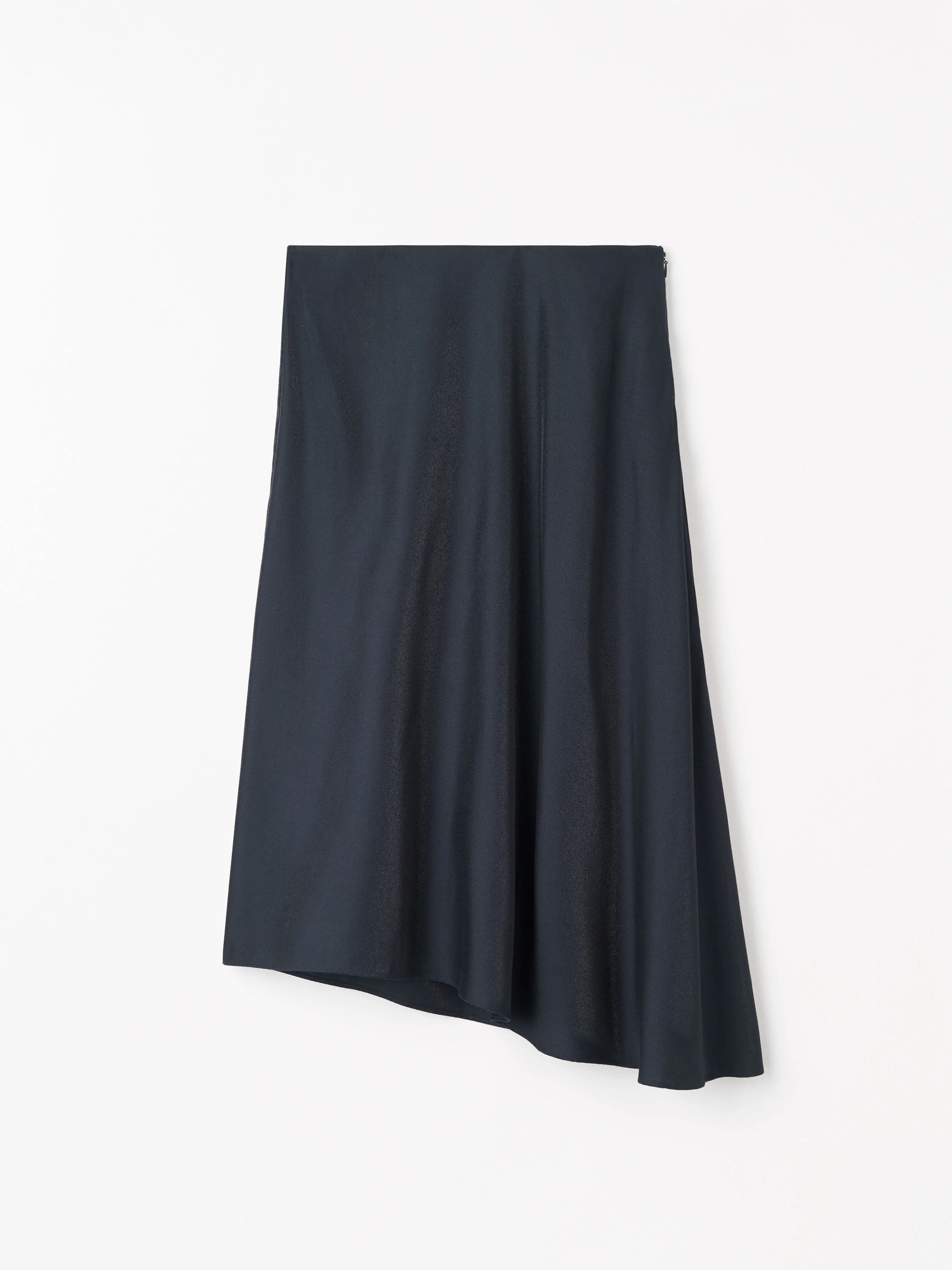 The Reylynn midi skirt boasts a graceful semi-flared silhouette. A distinctive pin-flared drape on the left adds fluid movement and refined volume, creating a perfectly balanced, elegant shape. Crafted from fabric with an iridescent effect and a semi-metallic texture, available in a sophisticated light ink colour. Reylynn can be worn as a matching set with the Lei blouse for a seamless, polished look. Product Details - 83% Viscose, 17% Polyamide - Midi skirt in a viscose fabric, with an iridescent effect and semi-metallic texture - Fully lined, with waistline finished in facing in shell fabric - Invisible zip with hook and eye closure at side seam - Mid length - Semi-flared silhouette - Pin-flared drape on left hand side - Asymmetrical hemline - Dart detail at back of waistline - Made in Romania - Model is 177 cm and wearing a size 36 - For a complete look, wear it with Caprio RWS Turtleneck and Vesperi Handbag - Art No.113781284