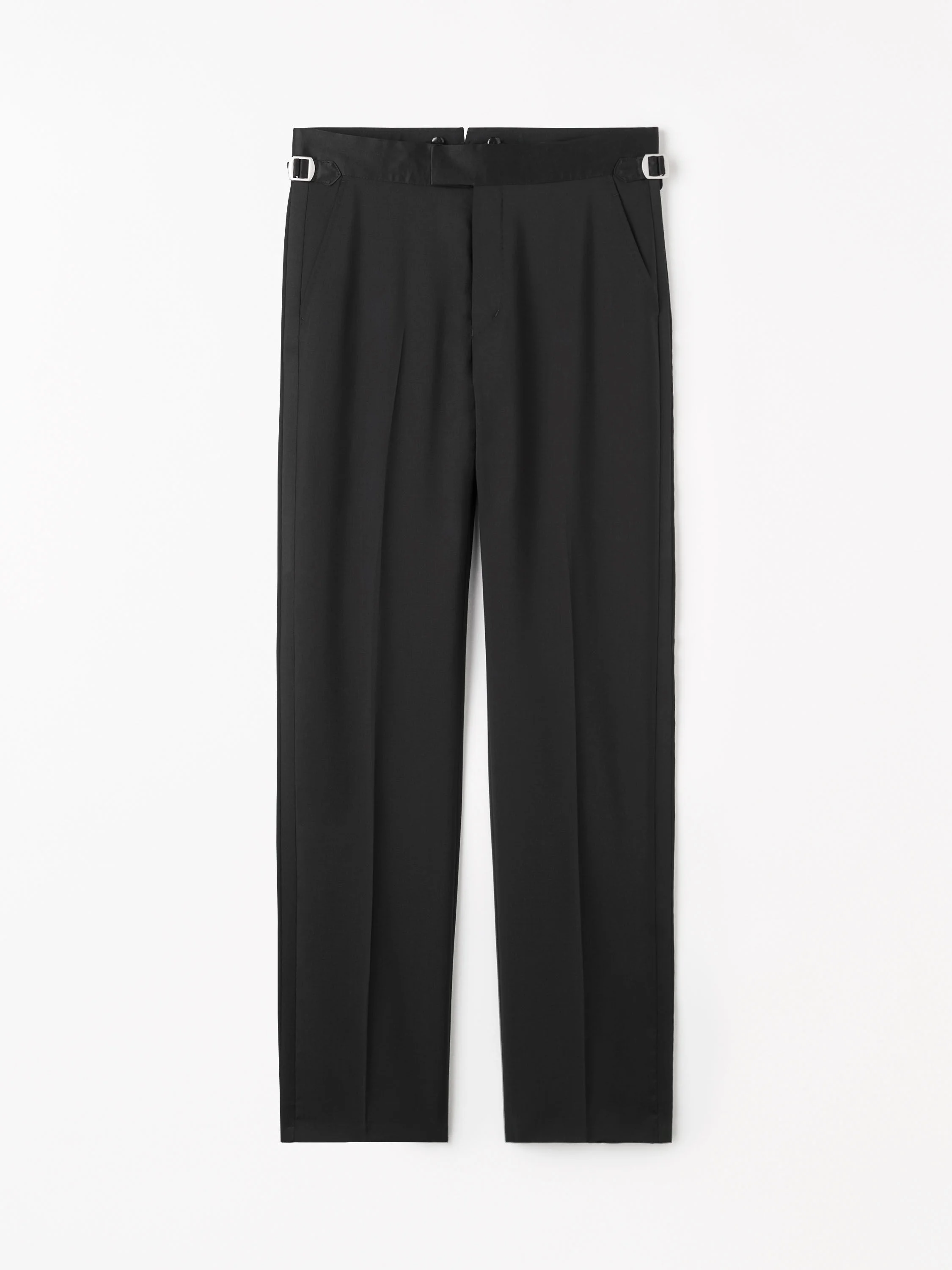 The Tucker tuxedo trouser is a masterfully tailored piece with a sleek, straight-leg silhouette. Featuring the classic contrast tape along the side seam, it stays true to traditional tuxedo styling while maintaining a modern edge. Product Details - 100% Wool - Tailored straight leg tuxedo trouser - It has the classic contrast tape on the side - The waistband, adjuster on the sides and back buttons are made of the same contrast fabric - It also has a split in back of the waistband and buttons on the inside for braces - Buttons for suspenders inside the waistband - Made in Romania - Model is 190 cm and wearing a size 48 - For a complete suit, wear it with Ease Tuxedo Jacket and Adley T Shirt and Nuptone Shoe - Art No.114065050