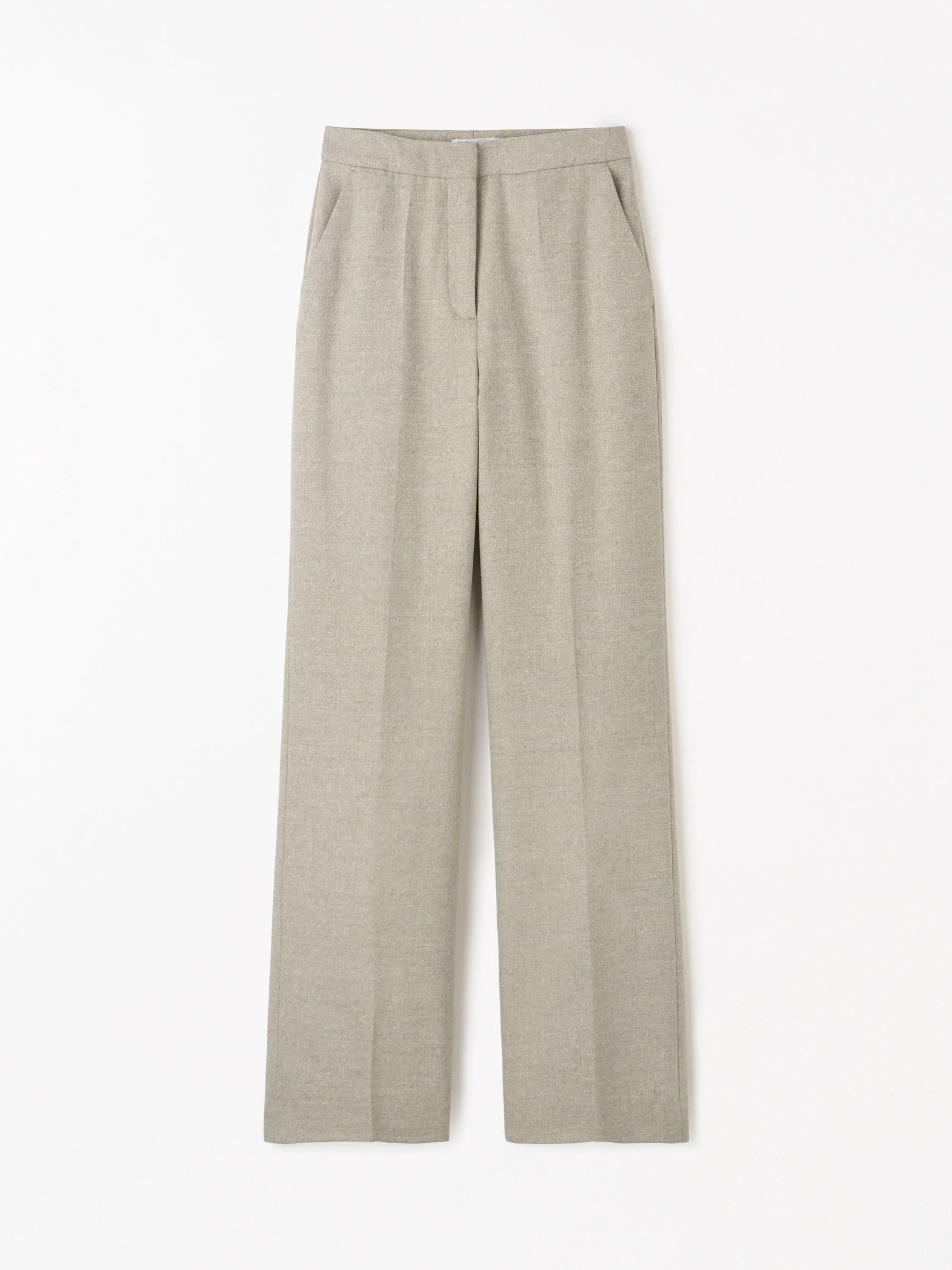 The Umaas mid-waist trousers are crafted in a regular fit with a full-length, wide straight leg for a timeless yet modern appeal. Designed with precision, they feature slanted pockets at the front and single welt pockets at the back, combining function with clean tailoring. Pressed creases run down the legs, adding structure and polish to the relaxed silhouette, making them a versatile piece for both casual and elevated styling. Product Details - 58% Wool, 29% Polyamide, 11% Silk, 2% Lycra - Modern trousers with a wide straight leg - Full length - Slanted pockets at front - Single welt pockets at back - Finished with pressed creases - For a complete look, wear it with Ellie RMS RWS Pullover and Eleanor Jacket and Zoka Shoe - Art No.113905107