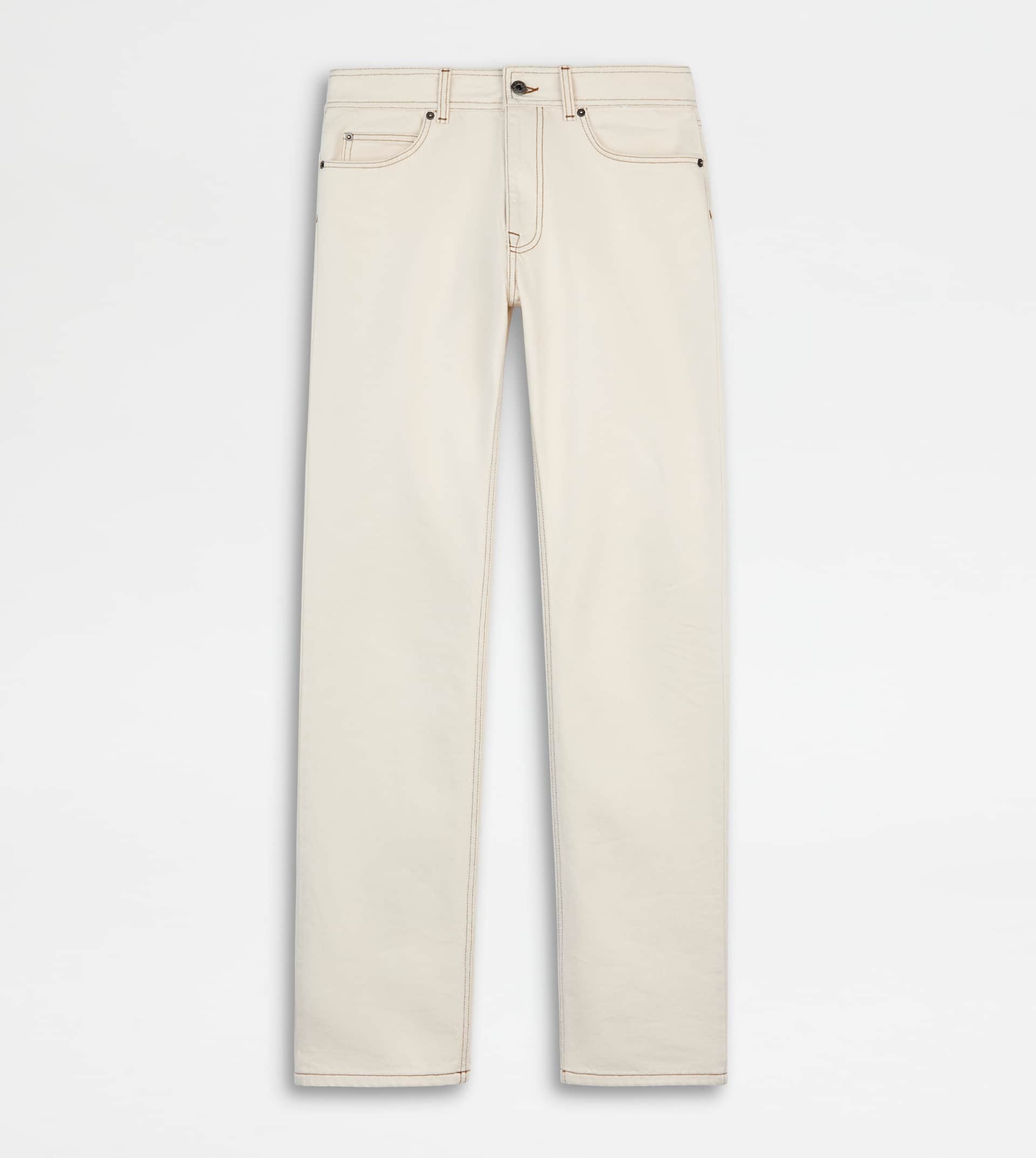 Regular-fit 5-pocket jeans in cotton. A true wardrobe evergreen, with branded metal rivets and leather Tod's tag on the coin pocket. - Made in Italy - 5 Pocket Jeans - Item composition: 100% cotton, leather detailing - Fitting: regular - Maintenance and care cards included