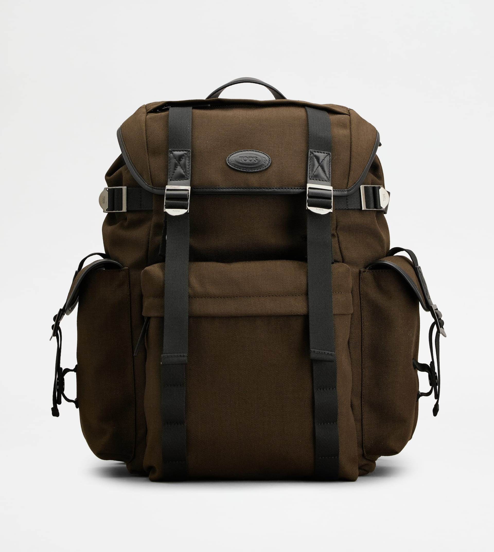 Backpack in fabric and nappa leather, with handle strap and adjustable shoulder straps. Closed with flap and branded metal buckles, it features a flat upper pocket and wide zipped front pocket. The sides come with practical flap pockets, while the interior features a drawstring with branded slider. - Dimensions: L 14.6 ins x H 15.4 ins x D 8.3 ins - Handle: height (drop) 2.8 ins - Adjustable shoulder straps - Made in Italy - Backpack in fabric - Item crafted in fabric - Nappa leather inserts - Tod's logo stamped on the front - Flat zipped upper pocket - Zipped front pocket - 2 side pockets with flap and metal buckle - Flap, metal buckle and drawstring closure - Fabric lining - Zipped internal pocket - Maintenance and care cards included - Branded dustbag