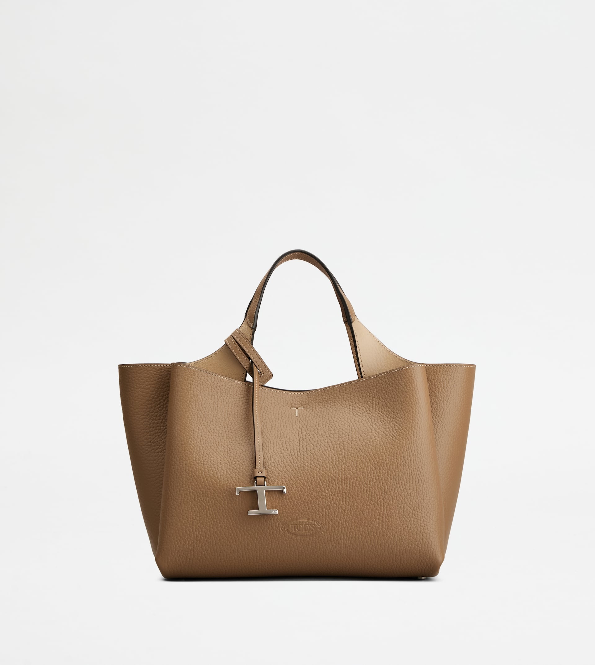 Bag in soft exposed grain leather, with Tod's logo stamped on the front, flat handles and removable shoulder strap. The interior comes with three compartments separated by zipped central pockets. An elegant creation enhanced by distinctive iconic detailing, such as the metal T Timeless pendant and T-stitching. - Dimensions: L 11.4 ins x H 7.7 ins x D 7.1 ins - Handles: height (drop) 5.9 ins - Adjustable and removable shoulder strap - Made in Italy - Bag in leather - Item crafted in leather - Tod's logo stamped on the front - Removable pendant with metal T Timeless accessory - Snap hook closure - 3 compartment interior - 2 internal flat zipped pockets - Maintenance and care cards included - Branded dustbag