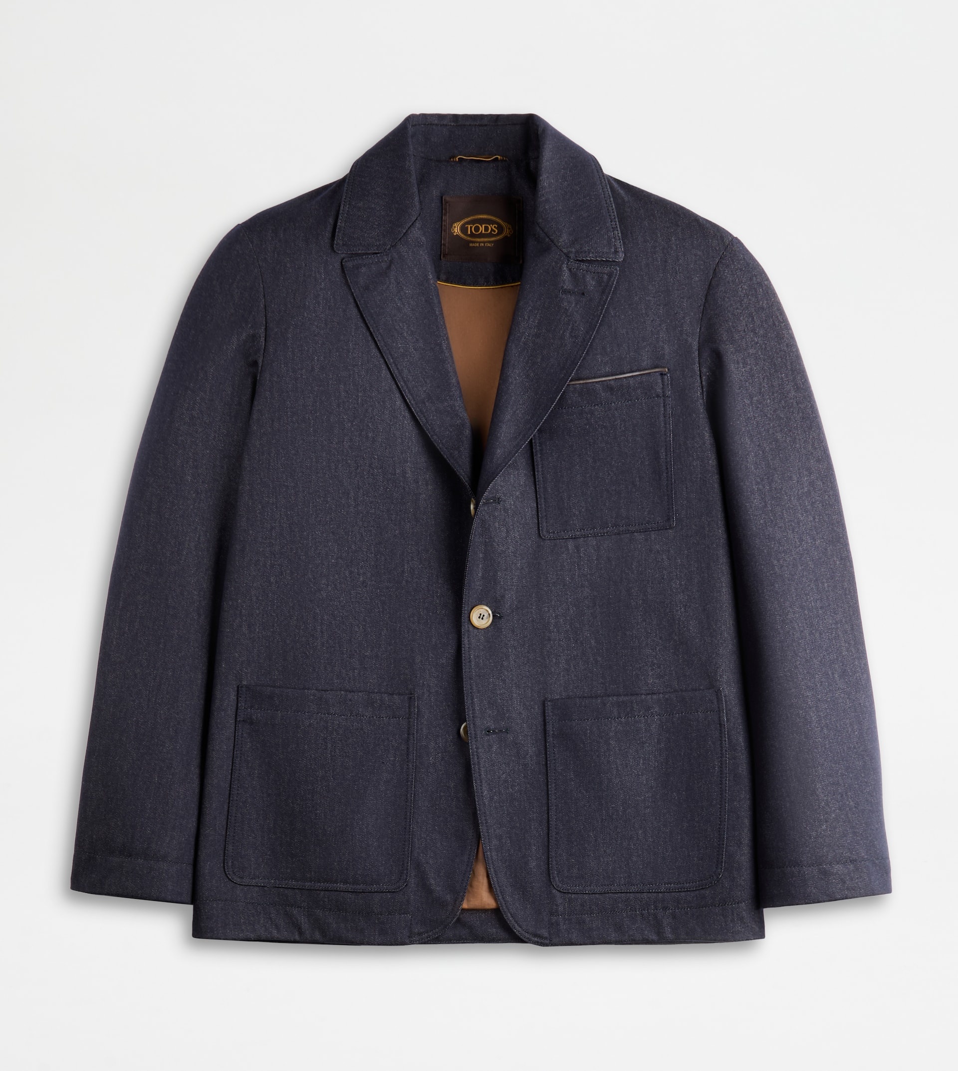 Blazer in refined pure wool denim, with water-repellent and windproof properties. Characterized by lapels, three patch pockets and branded buttons, it comes with leather piping detailing and the rectangular patch on the back with stamped Tod's logo. - Made in Italy - Blazer in wool - The model is 6' 2'' and wears size M (IT) - Item composition: 100% wool with water-repellent and windproof membrane, leather detailing, body lining 100% cotton, sleeve lining 100% cupro - Maintenance and care cards included