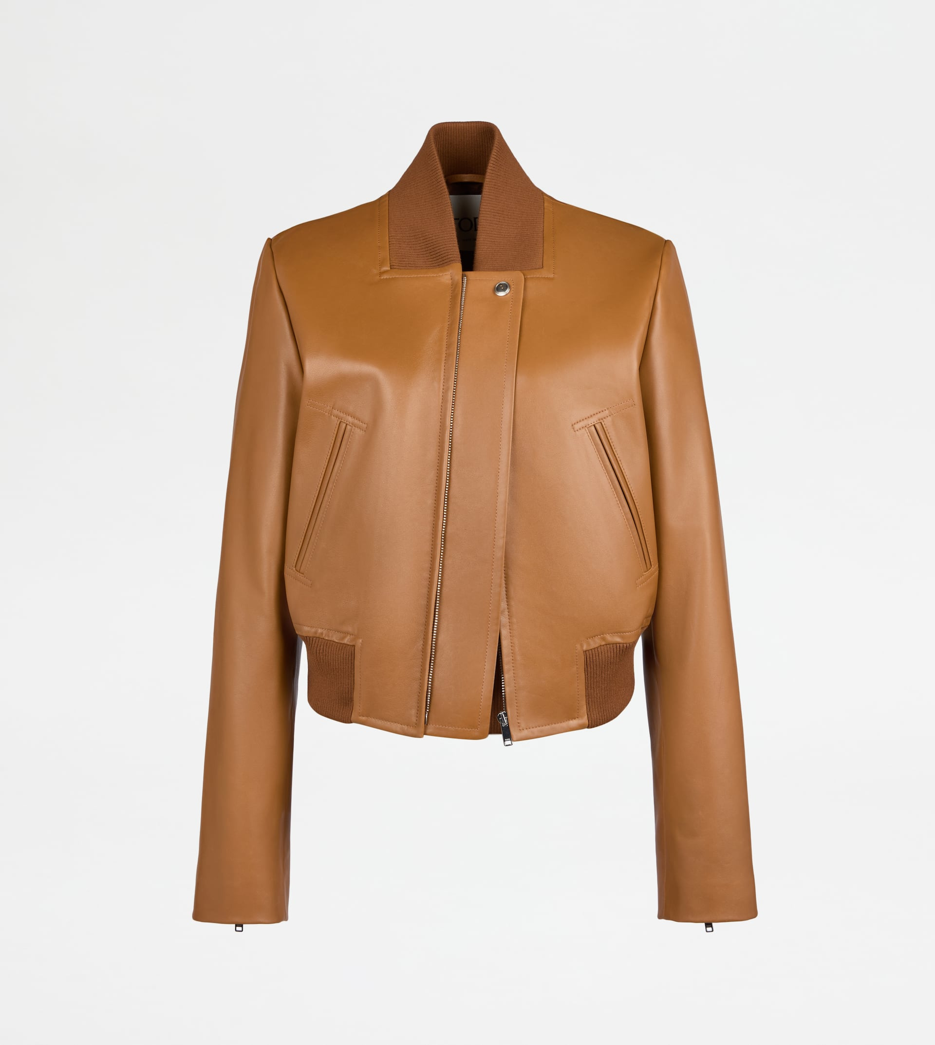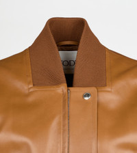Cropped bomber jacket in leather, with ribbed knit collar and bottom hem. Featuring an original zip and branded snap fastening, it comes with slanted welt pockets and the Tod's monogram embroidered on the back. - Made in Italy - Bomber jacket in leather - Fitting: slim - Item composition: 100% leather, knit hem 82% virgin wool, 15% polyamide, 3% elastane, lining 100% cotton, second lining 100% viscose - Maintenance and care cards included
