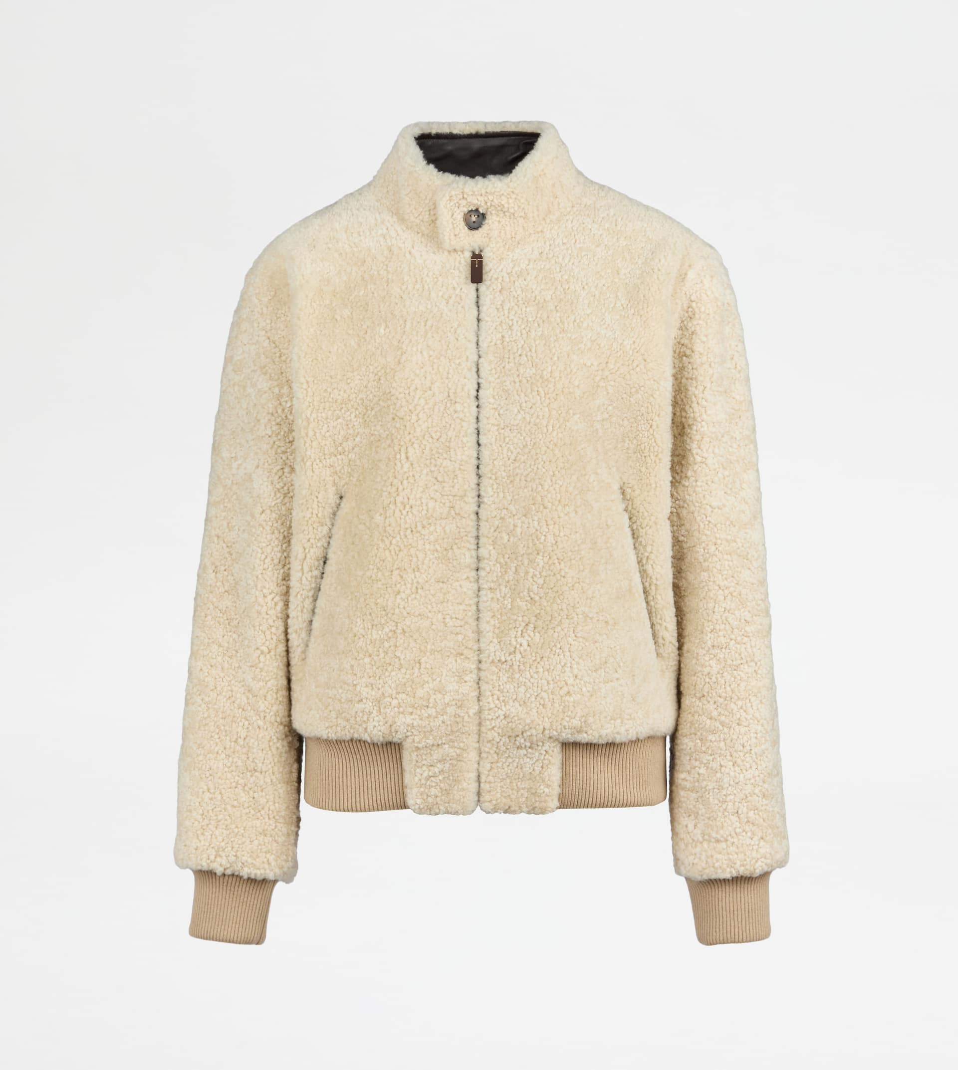 Warm and soft, this bomber jacket is crafted in shearling with leather inserts and slanted pockets. Featuring ribbed cashmere knit cuffs and bottom hem, it comes with the T-stitching on the leather zip pull. - Made in Italy - Jacket in shearling - Fitting: regular - Item composition: lambskin fur, knit inserts 90% cashmere, 8% polyamide, 2% elastane, ovine leather detailing - Maintenance and care cards included