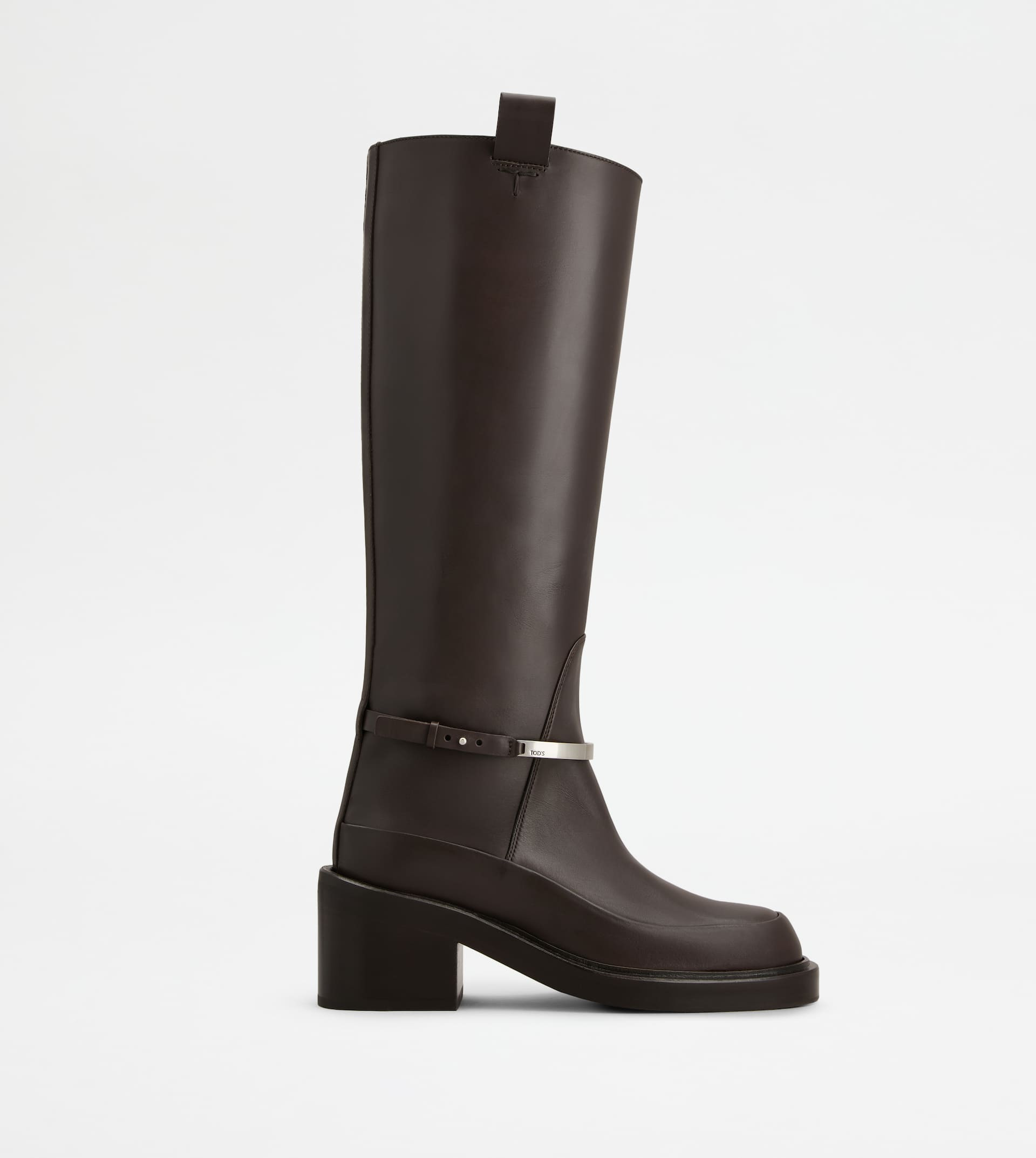 Inspired by the horse-riding world, these boots in leather come with a decorative ankle strap with a metal bar accessory. Featuring a medium heel and a rubber outsole, they come with an upper edge with side loops, highlighted by a refined T-stitching. - Made in Italy - Women's boots - Calfskin leather upper - Branded metal bar accessory - Leather lining and insole - Rubber heel 2.4 ins - Rubber outsole - Maintenance and care cards included - Branded dustbag